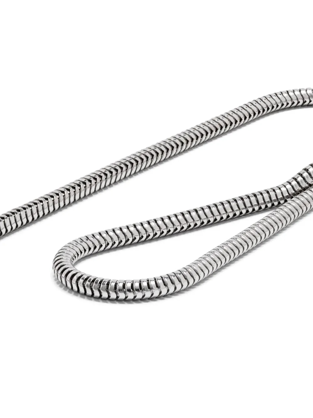Серебристый, переработанное серебро, родиевое покрытие, глянцевая фактура, цепь плетения «змейка» и застежка-карабин.