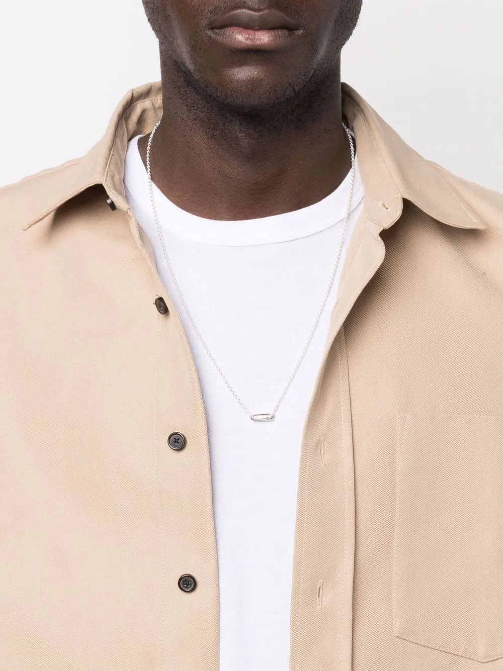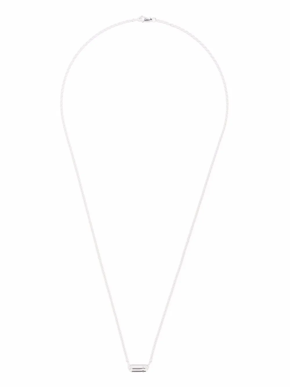 Выгравированный логотип, застежка на зажиме и цепочка на шею.