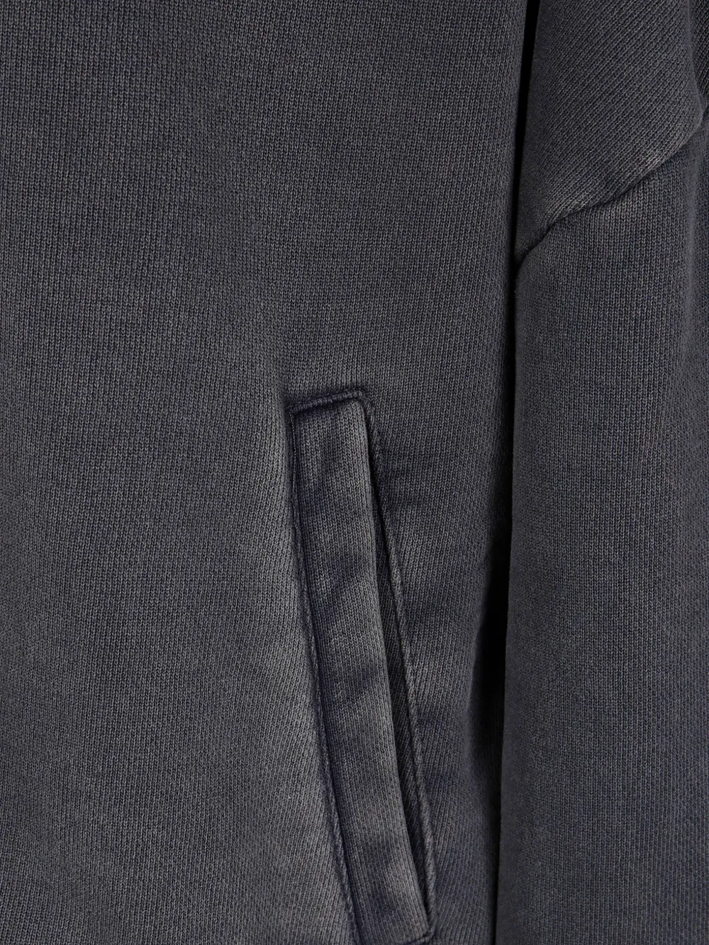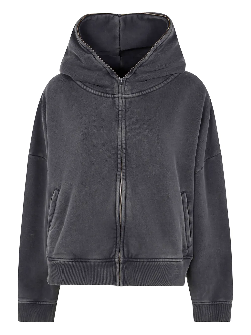 Черный с эффектом стирки, застежка-молния, капюшон, передние карманы, ребристый нижний край, ребристые манжеты