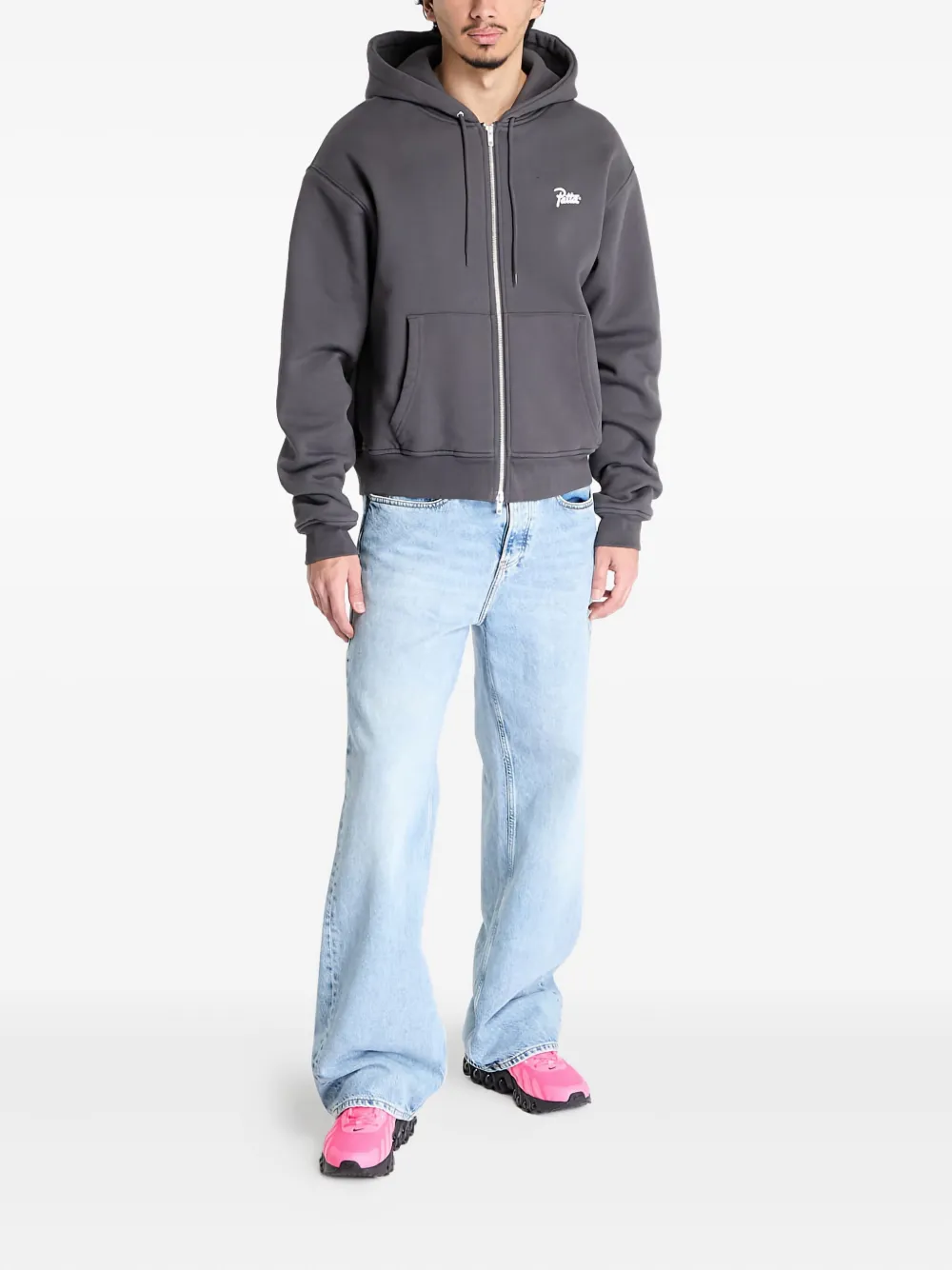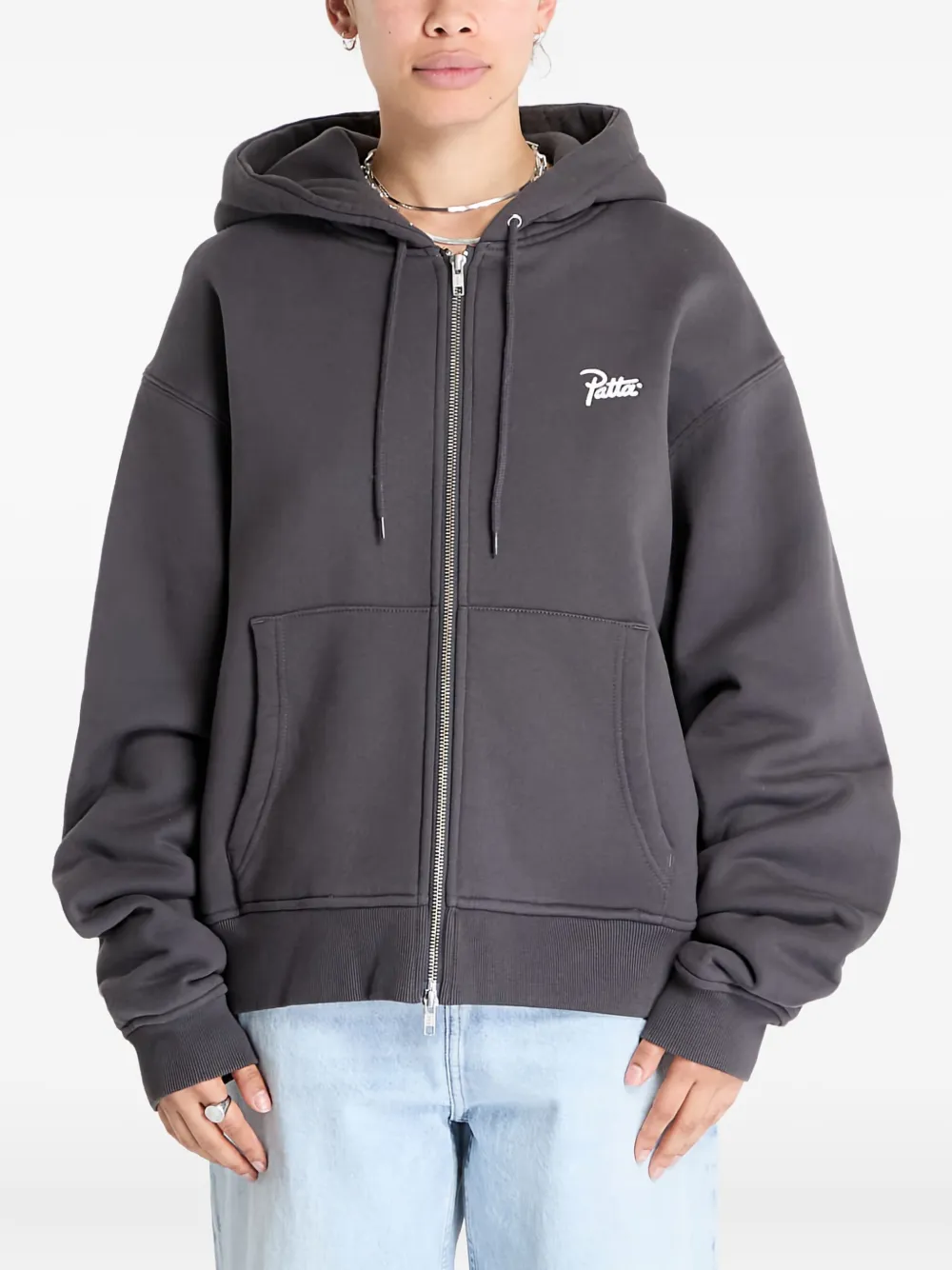 Серая куртка с капюшоном, застежкой-молнией, передним карманом-кенгуру, логотипом и ребристым нижним краем