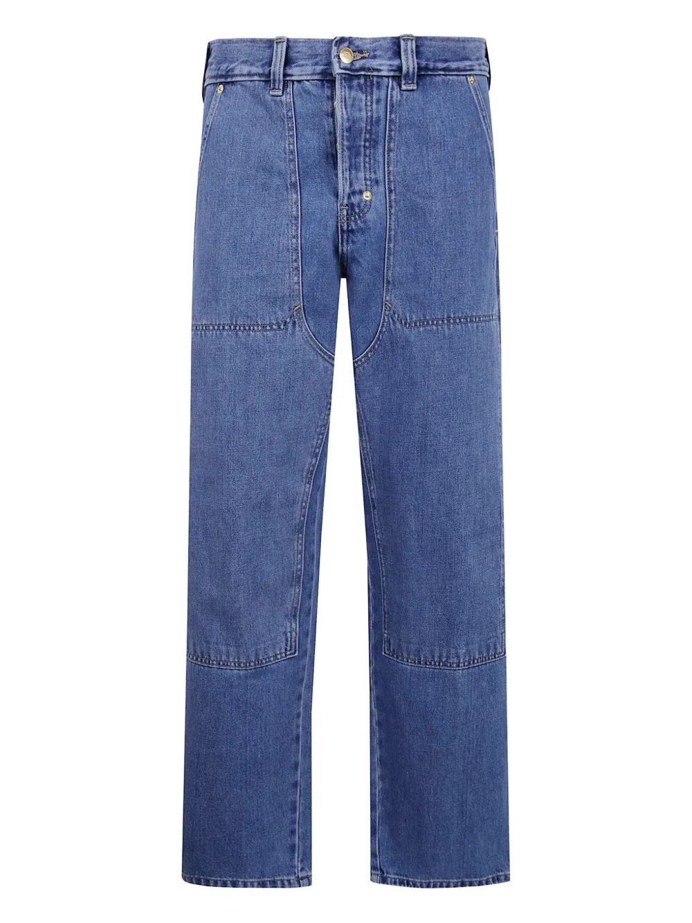 Индиго-синий цвет, панельный дизайн, контрастная строчка, шлевки для ремня, нашивка с логотипом сзади, пять карманов