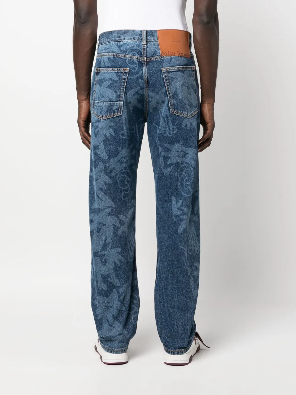 Синий, хлопок, деним, принт с изображением пальм, петли для ремня, нашивка с логотипом сзади, застежка на пуговицах спереди и пять карманов. Это унисекс-модель. Обратите внимание, что для нее используется мужская размерная сетка.