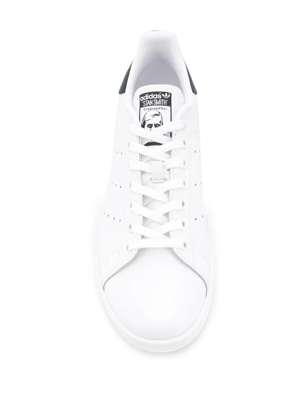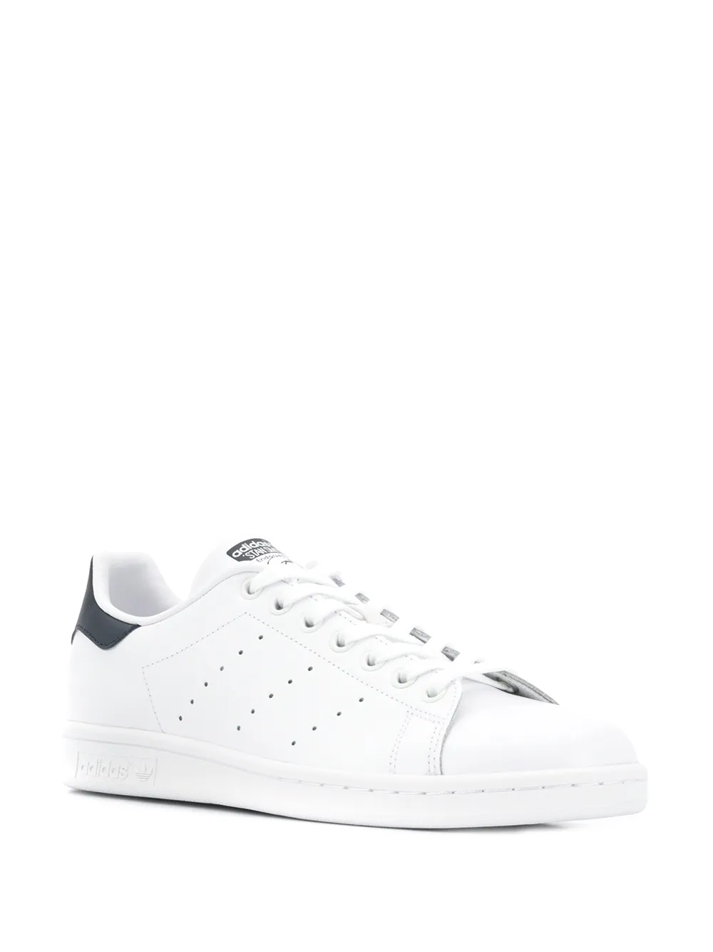 Кеды Stan Smith от adidas (Адидас). Закругленный носок, застежка на шнуровке, заплатка с логотипом на язычке, контрастная стойка на каблуке, перфорированная деталь и белая резиновая подошва.