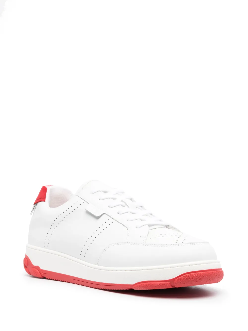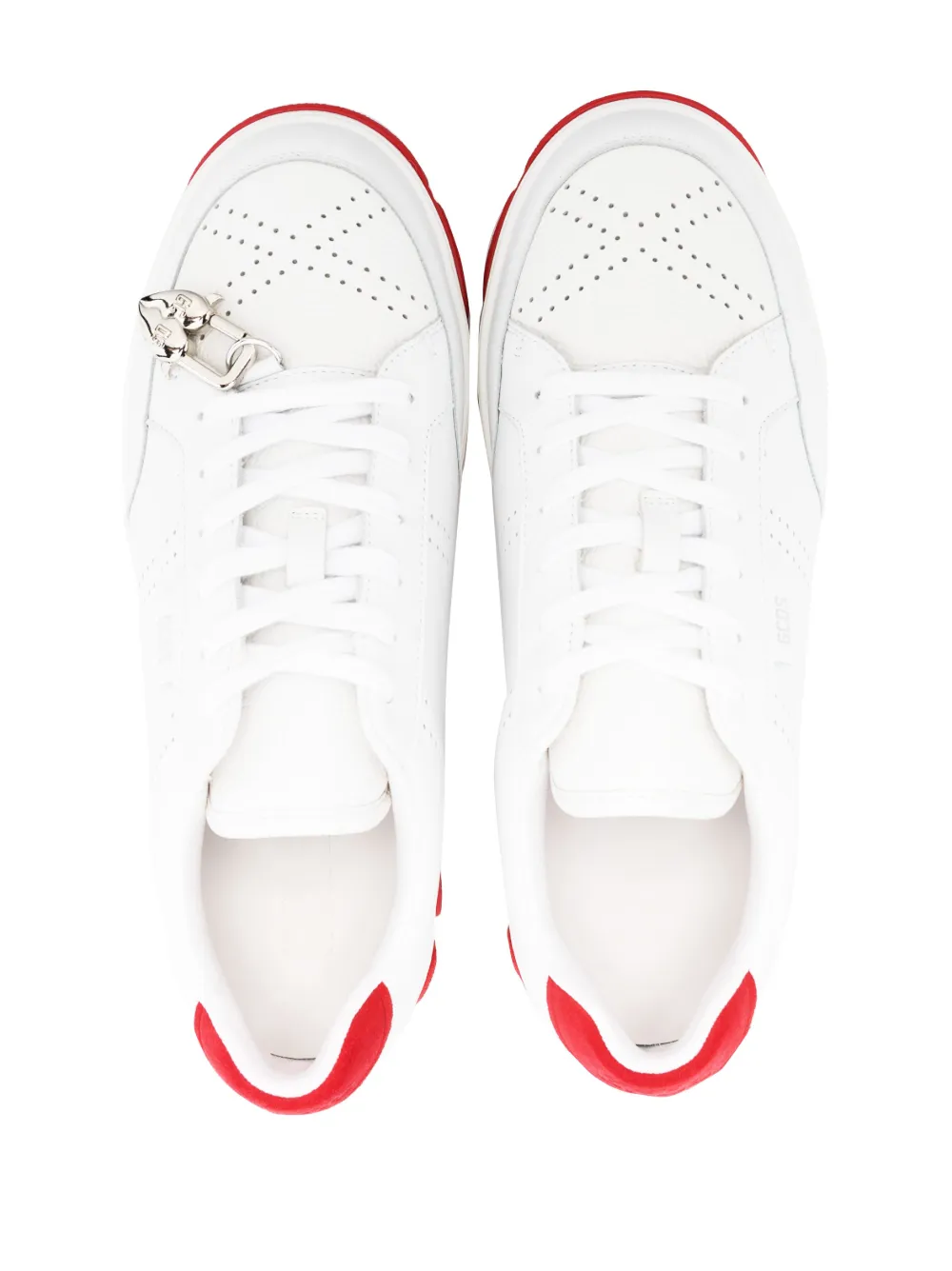 Белый, телячья кожа, тисненый логотип сзади, подвеска в форме сердца, вставки, перфорация, контрастный задник, миндалевидный носок, шнуровка спереди, стелька с логотипом и контрастная резиновая подошва. Это унисекс-модель. Обратите внимание, что для нее используется мужская размерная сетка.