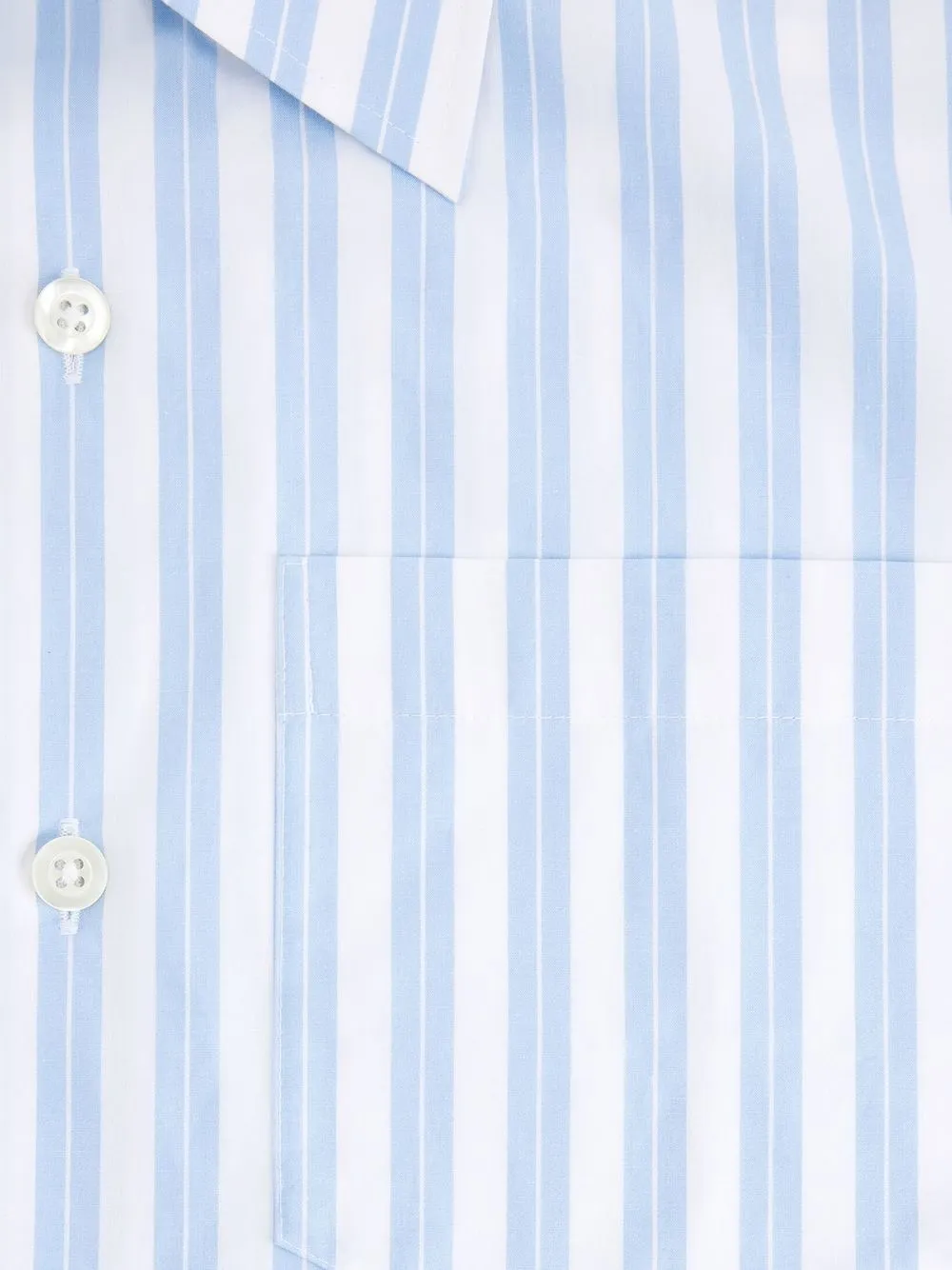 Белый, хлопок, узор в вертикальную полоску, закругленный подол, классический воротник, застежка на пуговицах спереди, длинные рукава и нагрудный накладной карман. Это унисекс-модель. Обратите внимание, что для нее используется мужская размерная сетка.