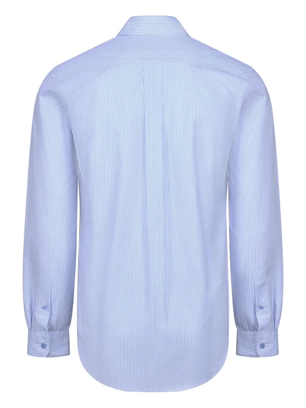 Светло-голубой вертикальный полосатый узор застежка на пуговицы спереди заостренный воротник длинные рукава нашивка с логотипом