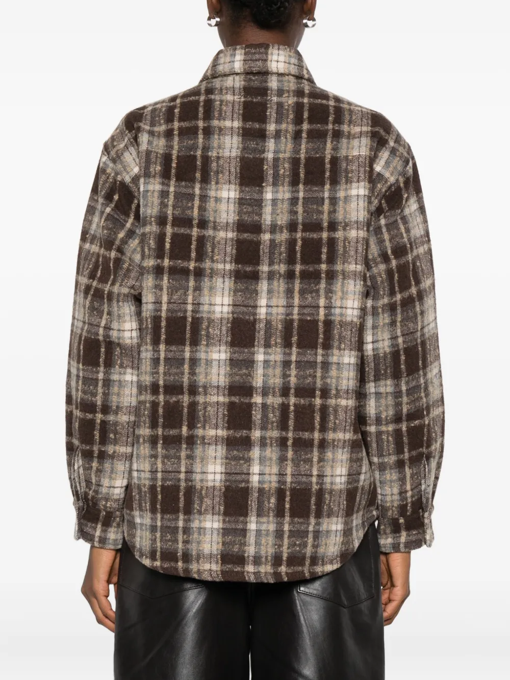 Коричневый клетчатый узор нагрудные накладные карманы застежка на пуговицы спереди длинные рукава закругленный подол