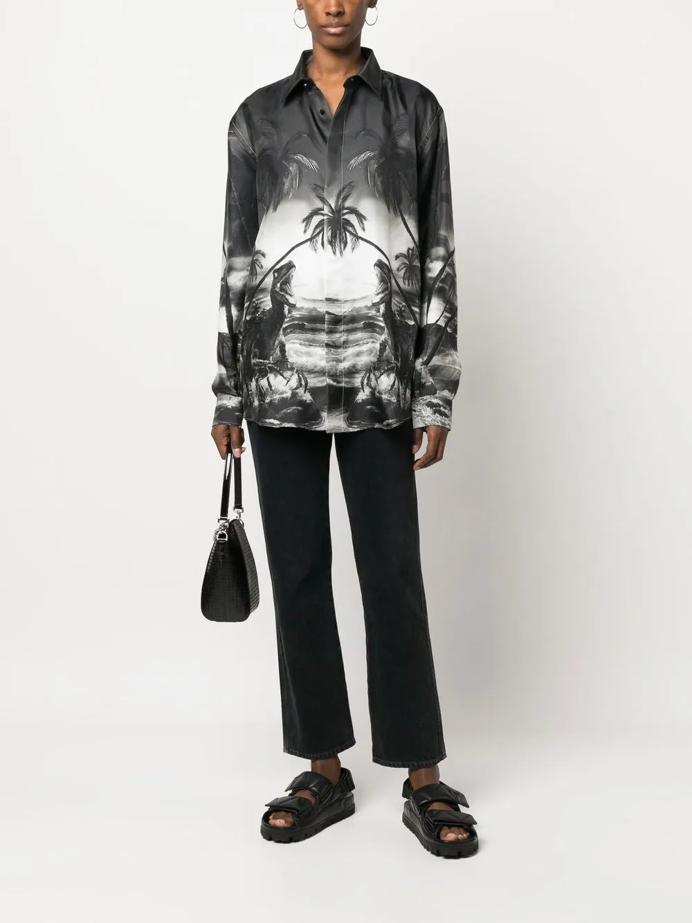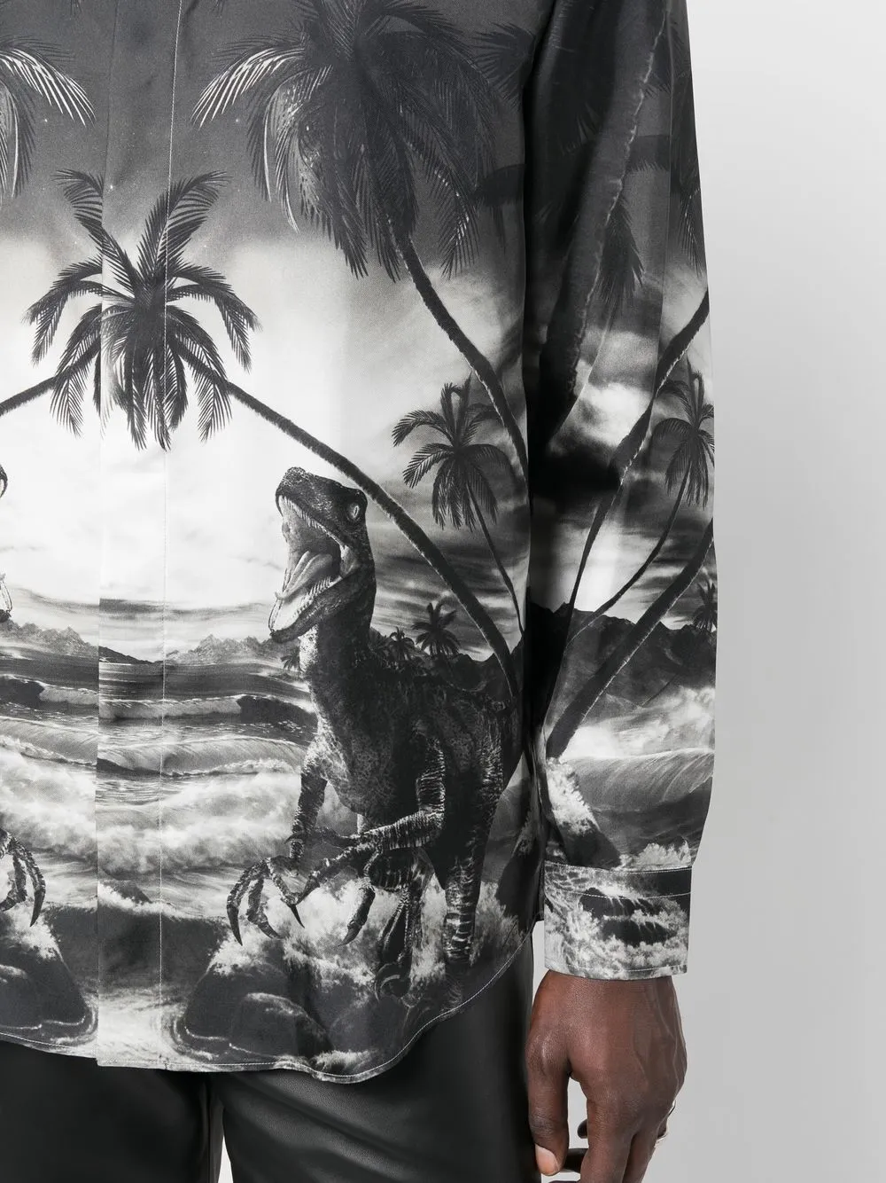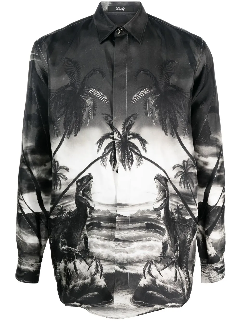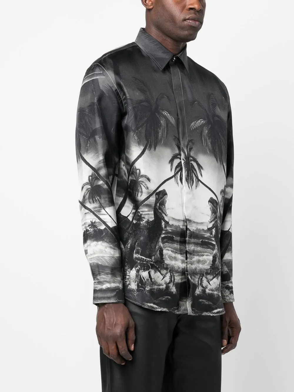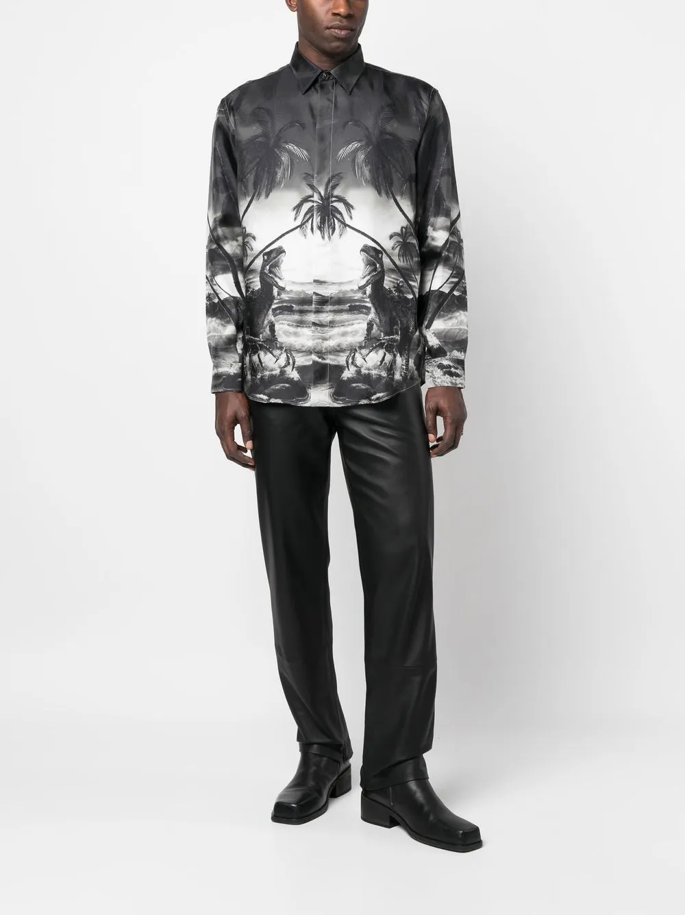 Черный, шелк, анималистичный принт, классический воротник, застежка на пуговицах спереди, длинные рукава, манжеты на пуговицах и закругленный подол. Это унисекс-модель. Обратите внимание, что для нее используется мужская размерная сетка.