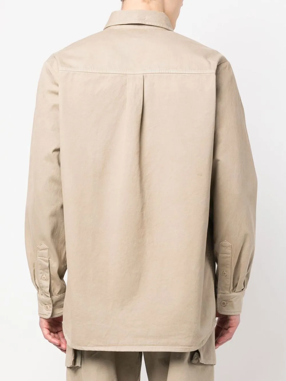 Бежевый, хлопок, классический воротник, нашивка с логотипом на груди, передние карманы с клапаном, застежка на пуговицах спереди, закругленный подол и длинные рукава.