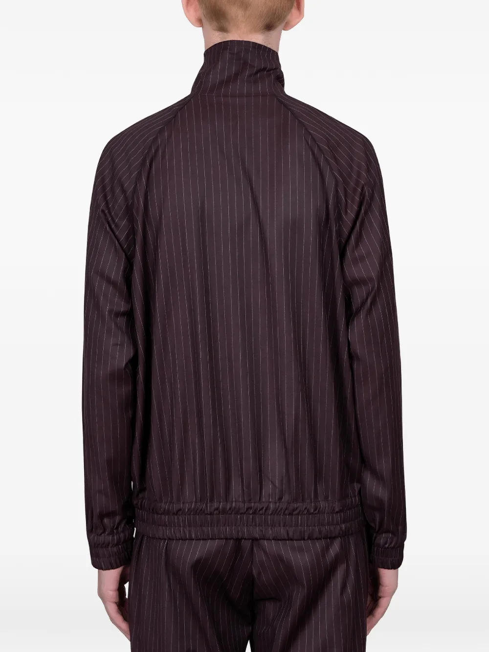 Коричневый цвет с узором в полоску, застежка-молния, высокий воротник, карманы на молнии, ребристый нижний край