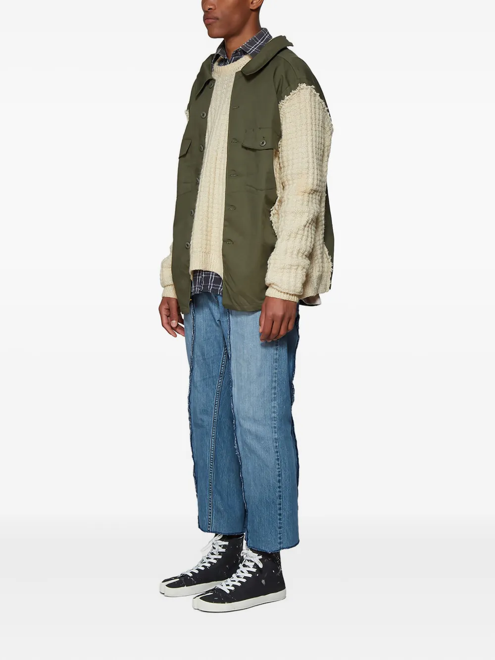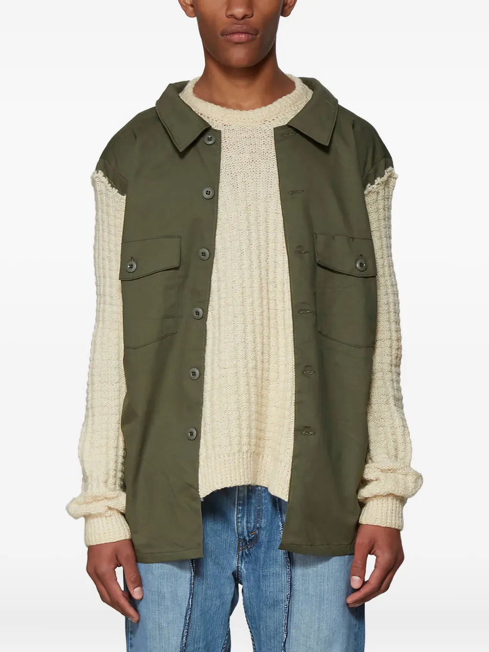 Оливково-зеленый фактурная крупная вязка многослойный дизайн отложной воротник нагрудные накладные карманы декоративная планка на пуговицах длинные рукава
