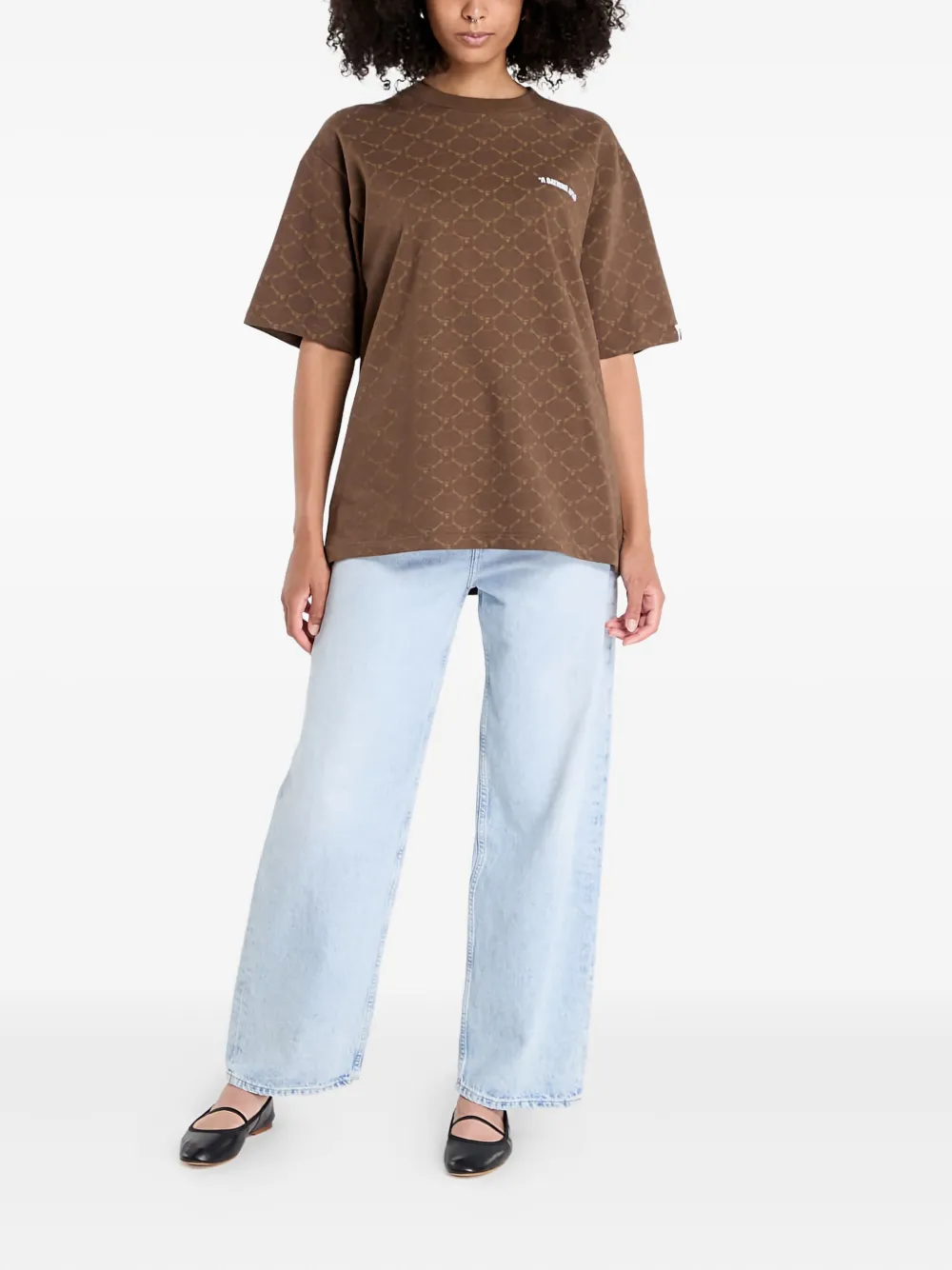 Коричневая футболка с узором по всей поверхности, круглый вырез, короткие рукава