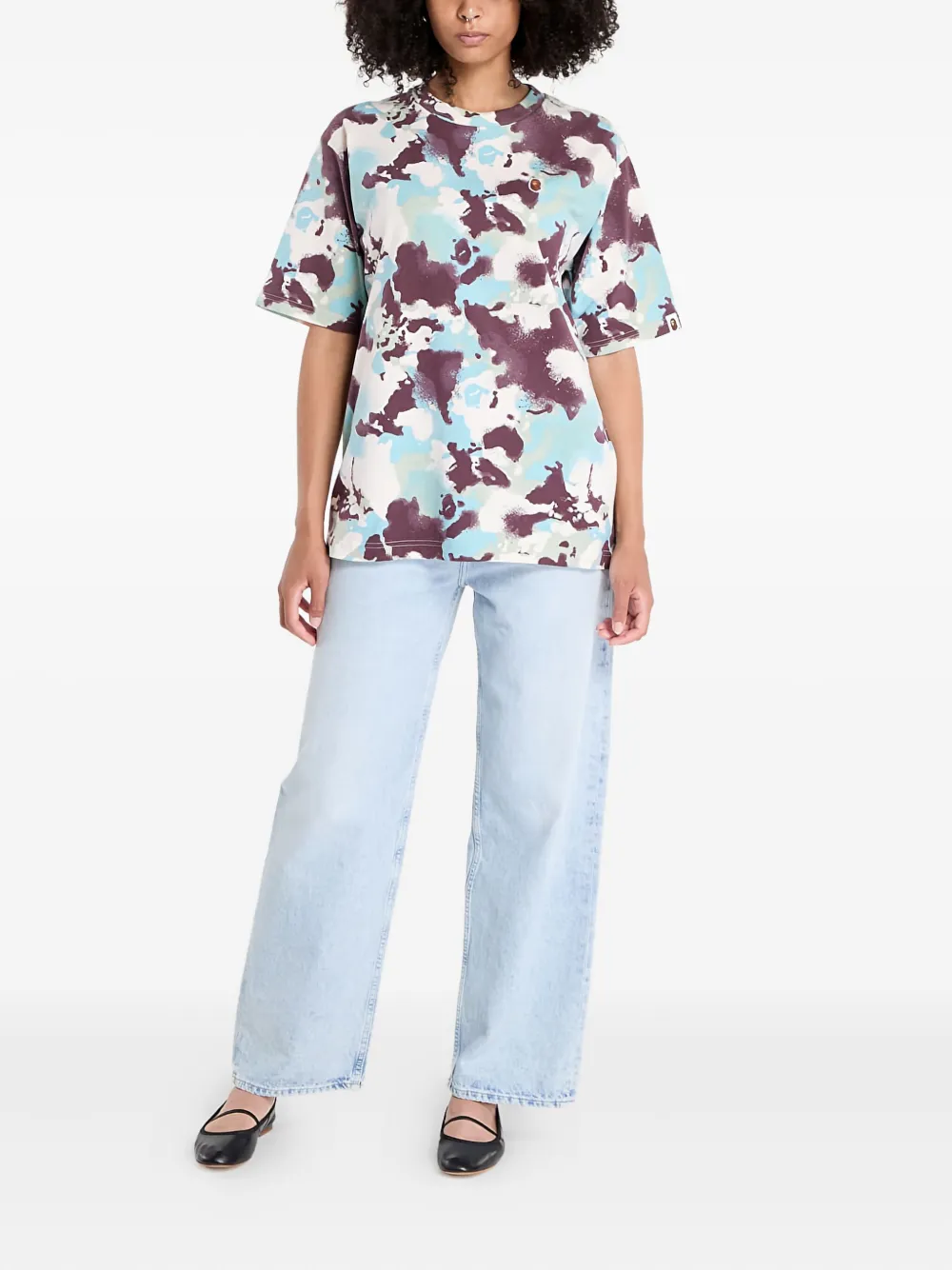 Бежевый и разноцветный узор, круглый вырез, короткие рукава, нашивка с логотипом