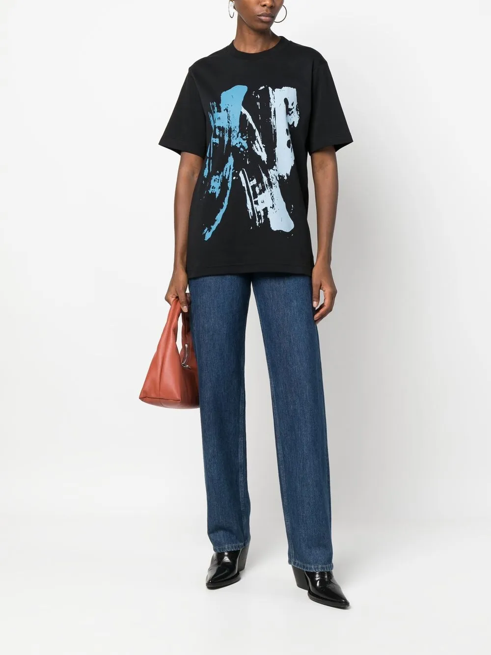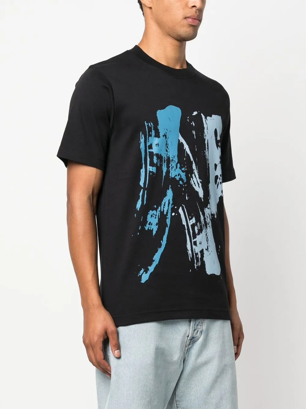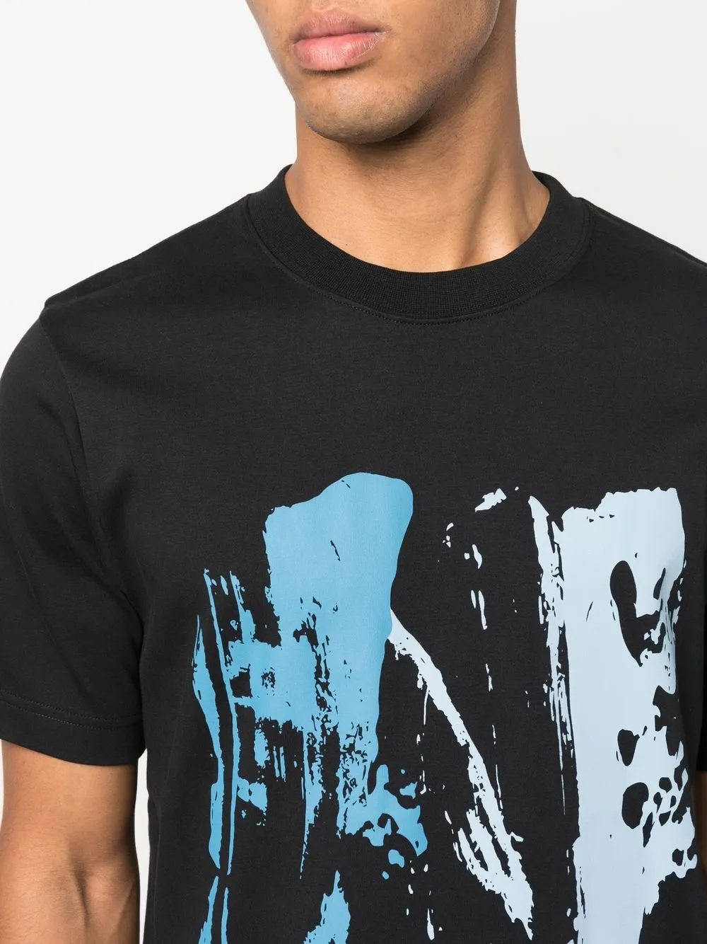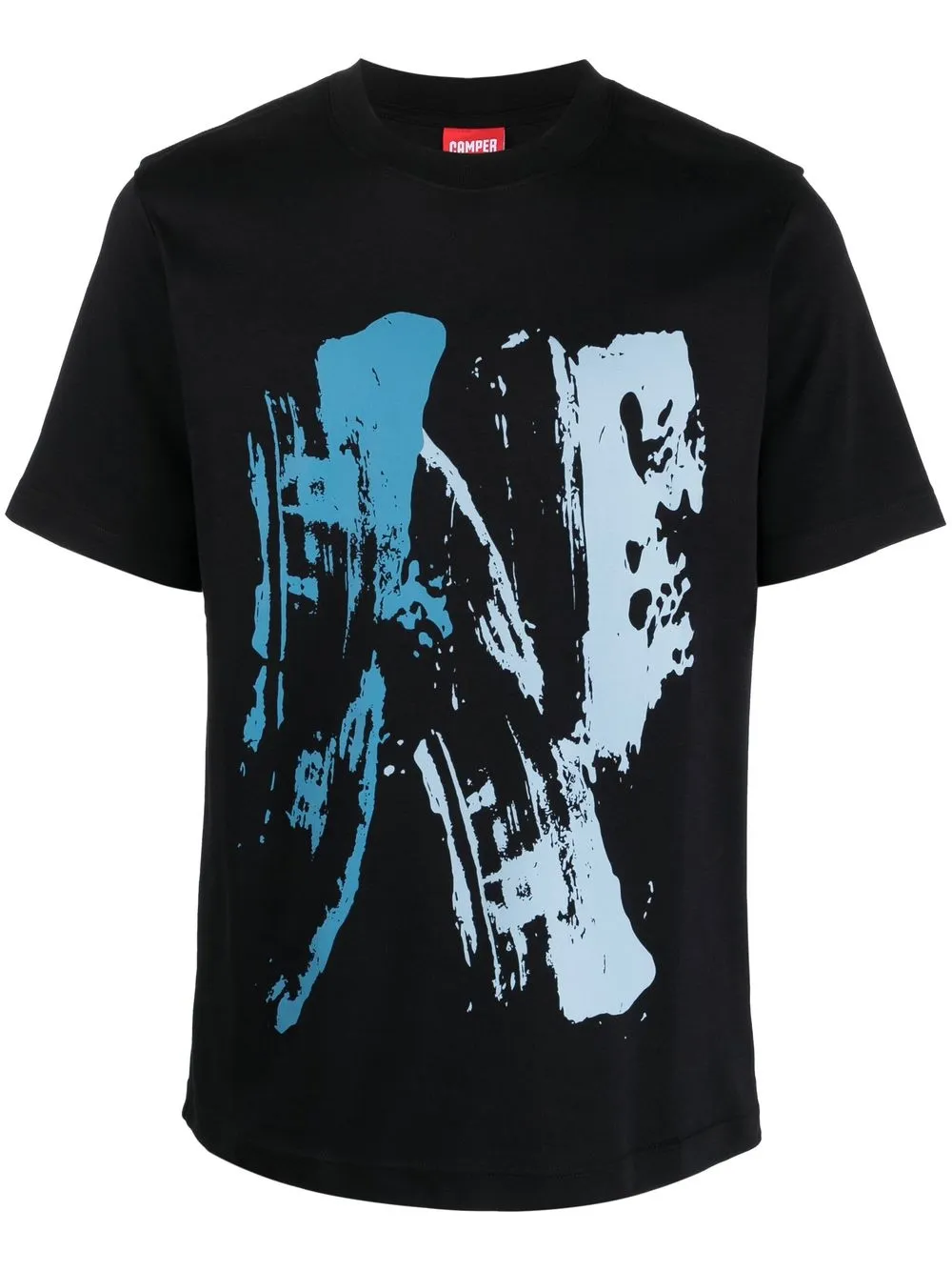 Черный, хлопок, живописный принт, круглый вырез, короткие рукава и прямой подол. Это унисекс-модель. Обратите внимание, что для нее используется мужская размерная сетка.