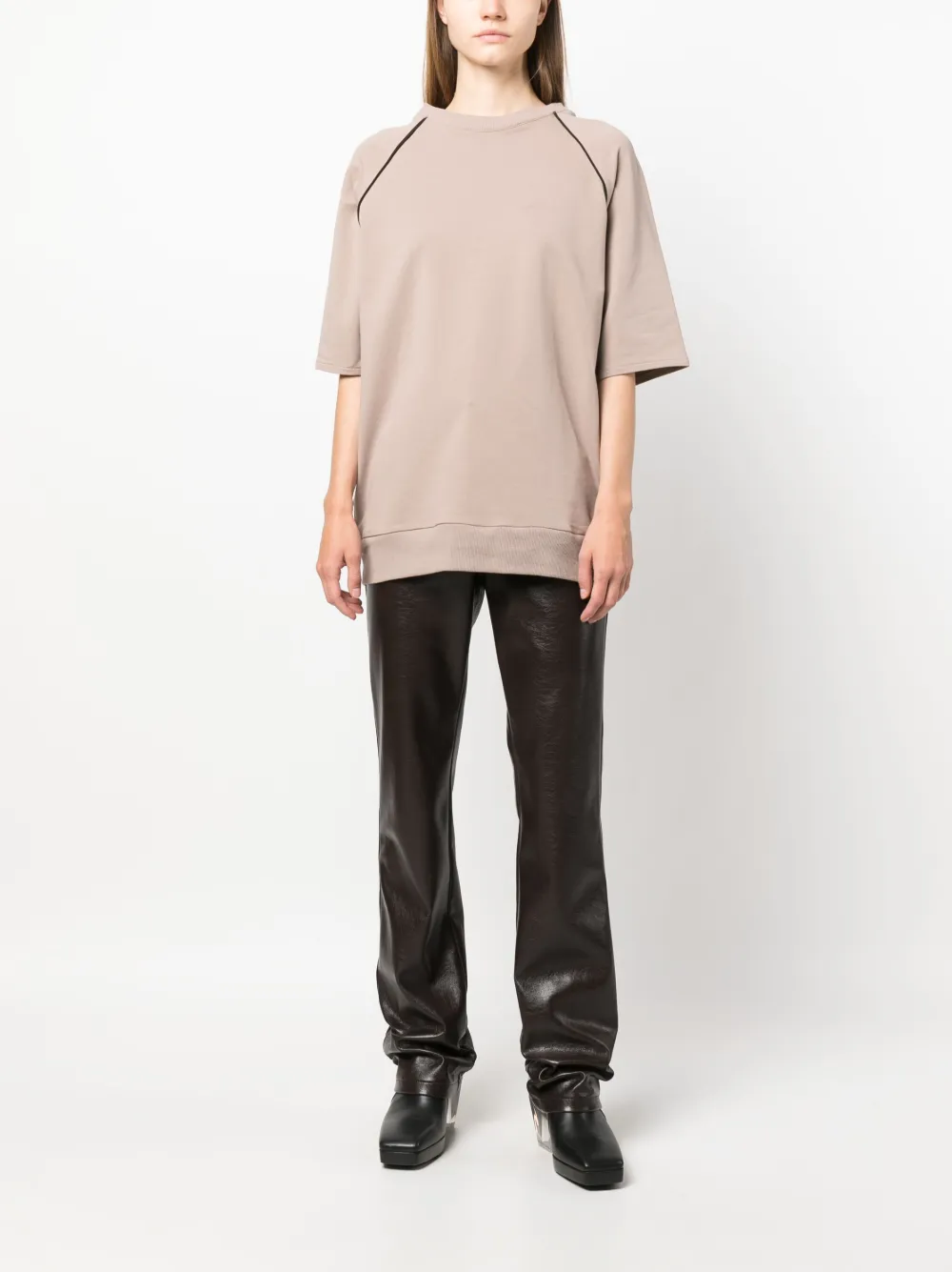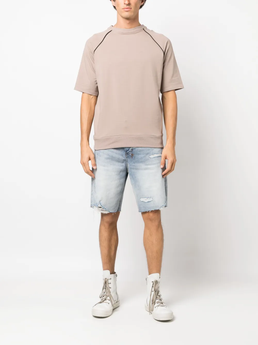Бежевый, эластичный хлопок, вышивка в диагональную полоску, круглый вырез, короткие рукава реглан и прямой подол.
