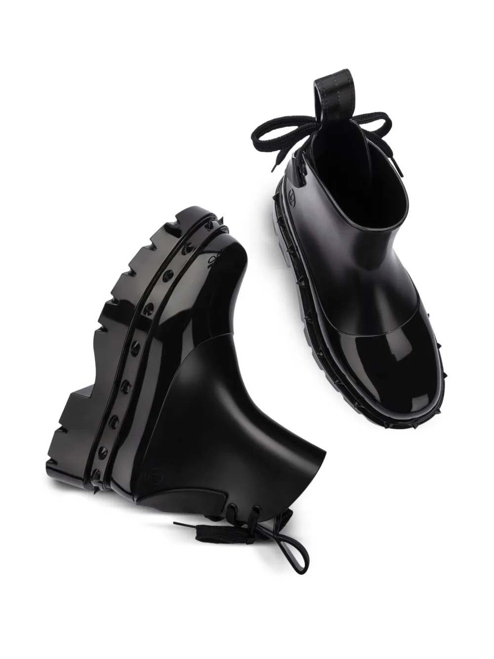 Черный, заклепки-шипы, закругленный носок, шнуровка сзади, стелька с логотипом, петля для подтягивания сзади и подошва на платформе.