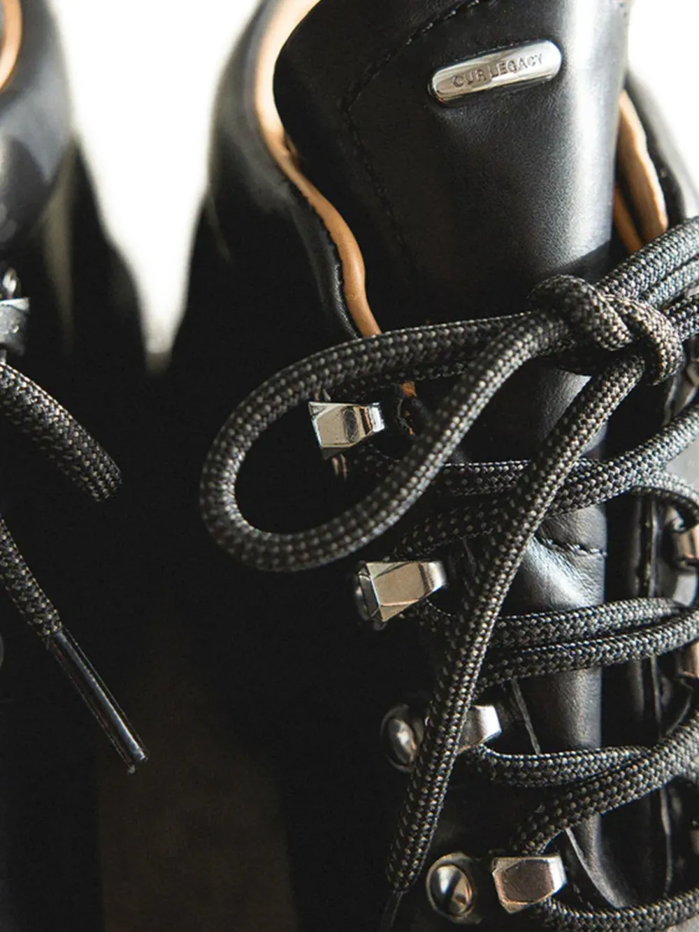 Верх из черной кожи, замшевая задник, шнуровка, металлические люверсы, резиновая подошва