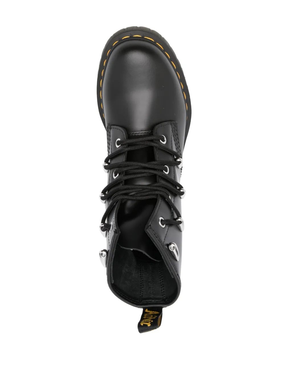 Черный, телячья кожа, заклепки-шипы, контрастная строчка, шнуровка спереди, закругленный носок, высота по щиколотку, стелька с логотипом, кожаная подкладка и рифленая резиновая подошва.