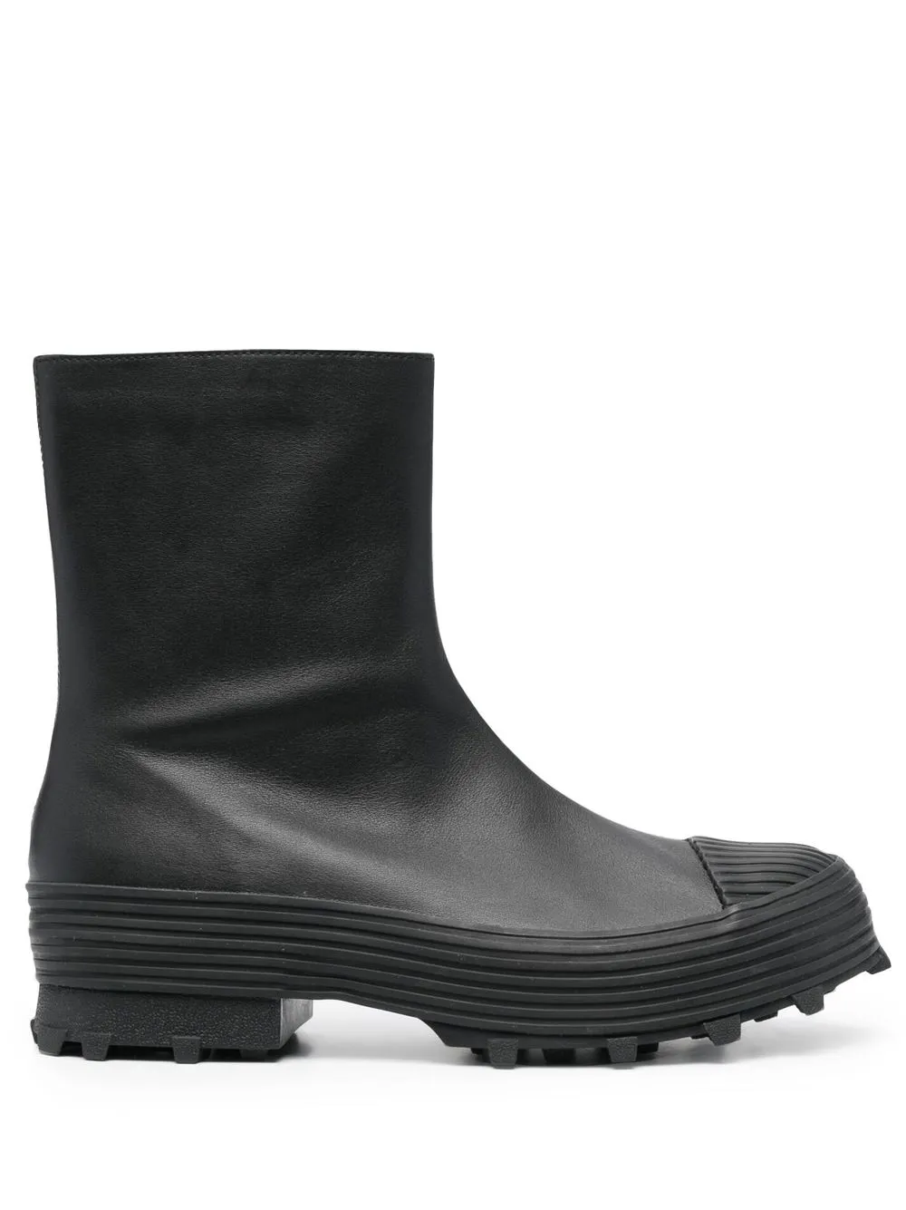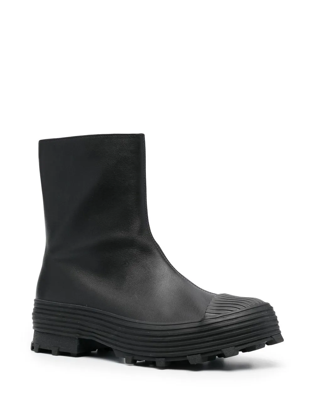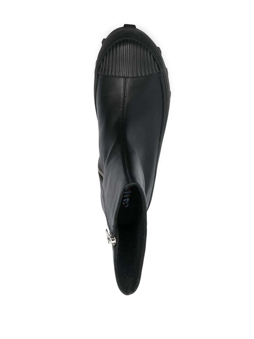 Черный, кожа, переработанный полиэстер, резиновый носок, закругленный носок, рифленая резиновая подошва, длина до середины голени и молнии на манжетах.