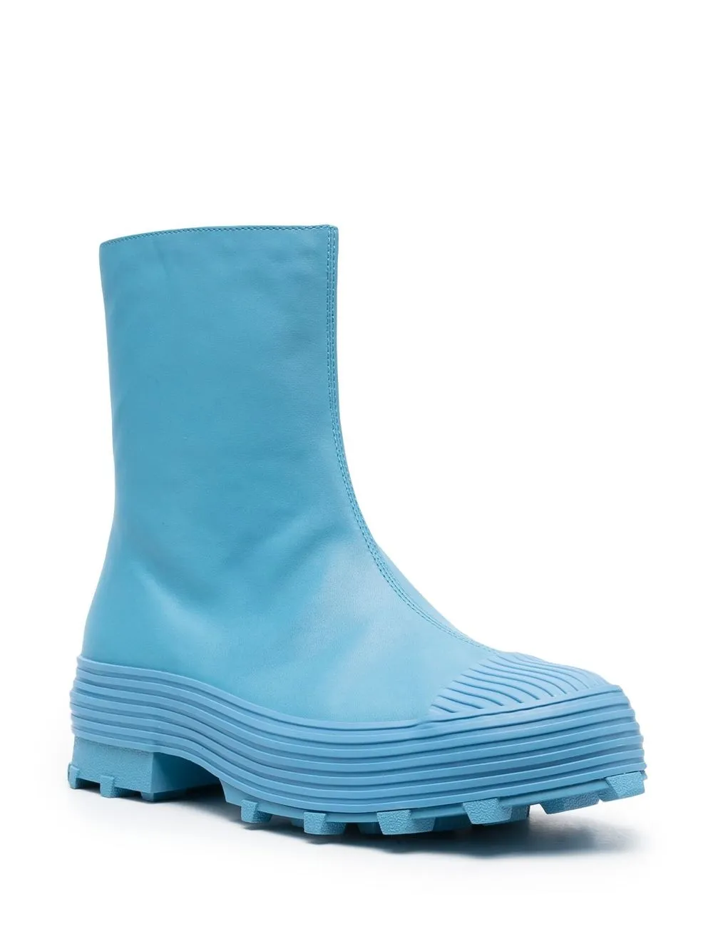 Синий, кожа, закругленный носок, застежки на молнии сбоку и рифленая резиновая подошва.