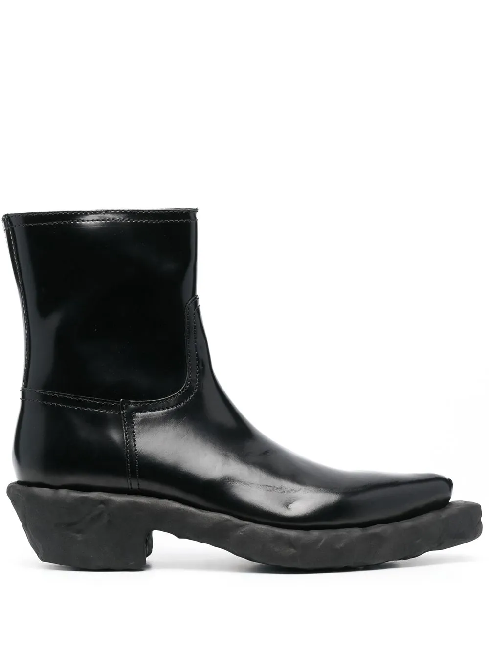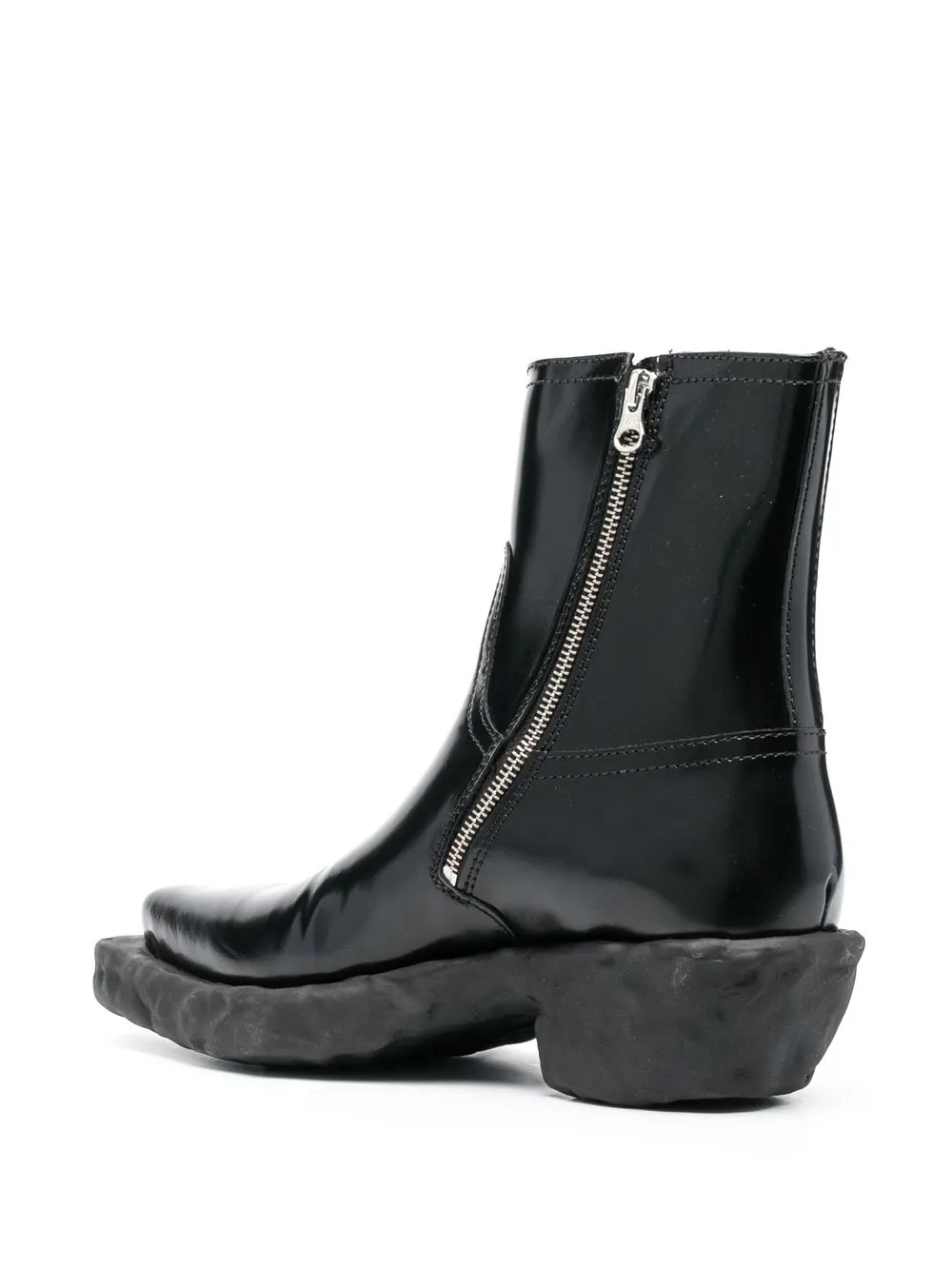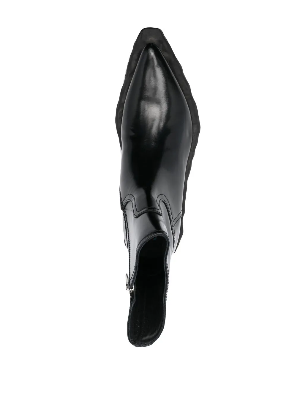 Черный, кожа, заостренный носок, модель в стиле вестерн, массивная резиновая подошва, низкий блочный каблук и молнии на манжетах.