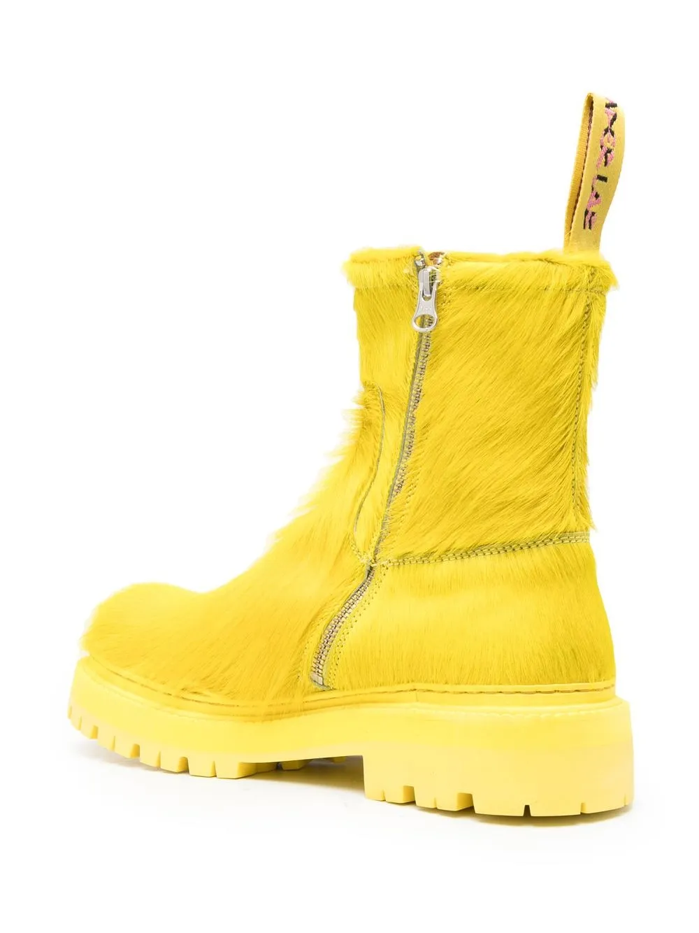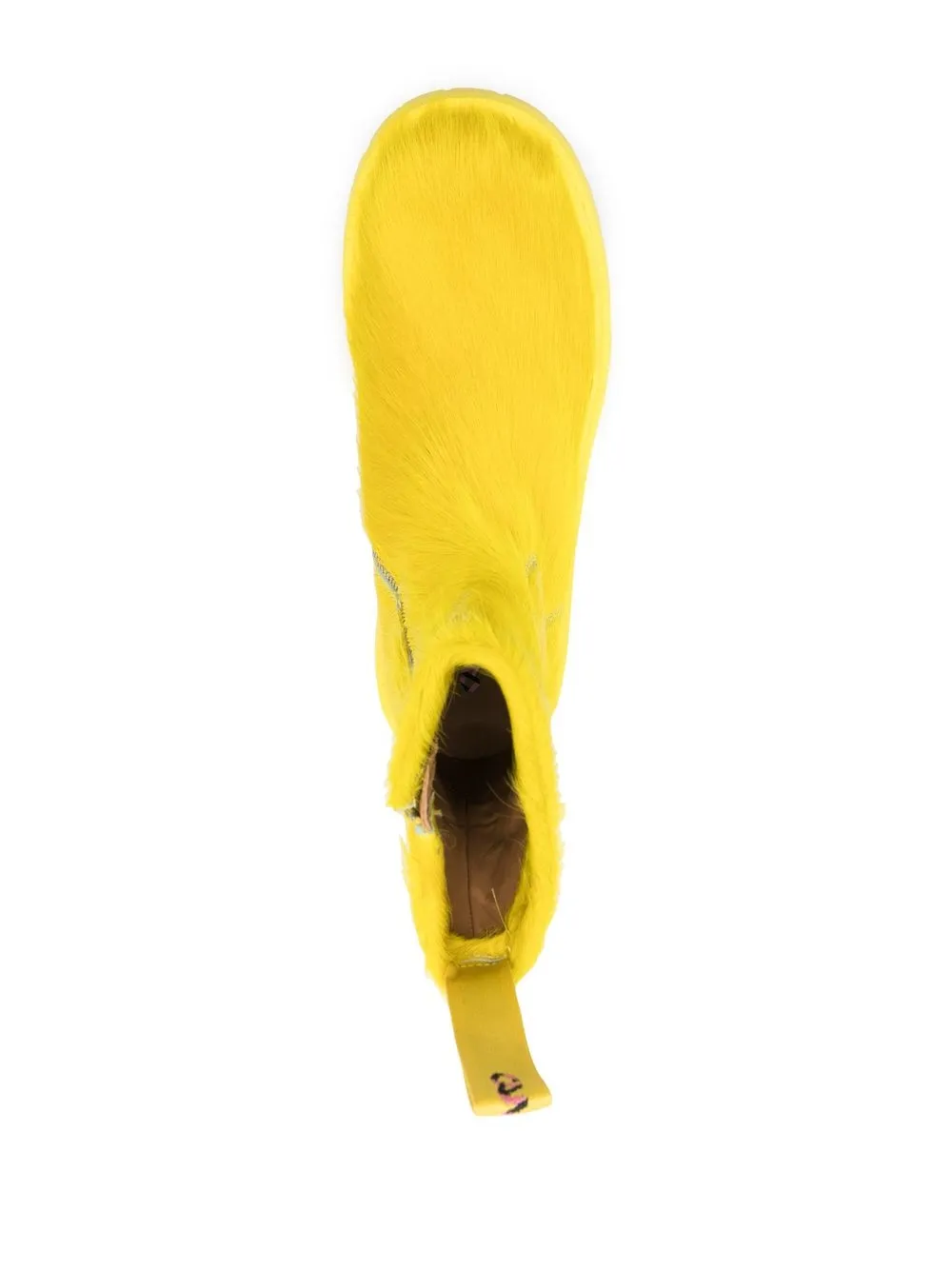 Желтый, телячья кожа, ворс теленка, закругленный носок, вставки, петля для подтягивания сзади и массивная резиновая подошва c протектором.