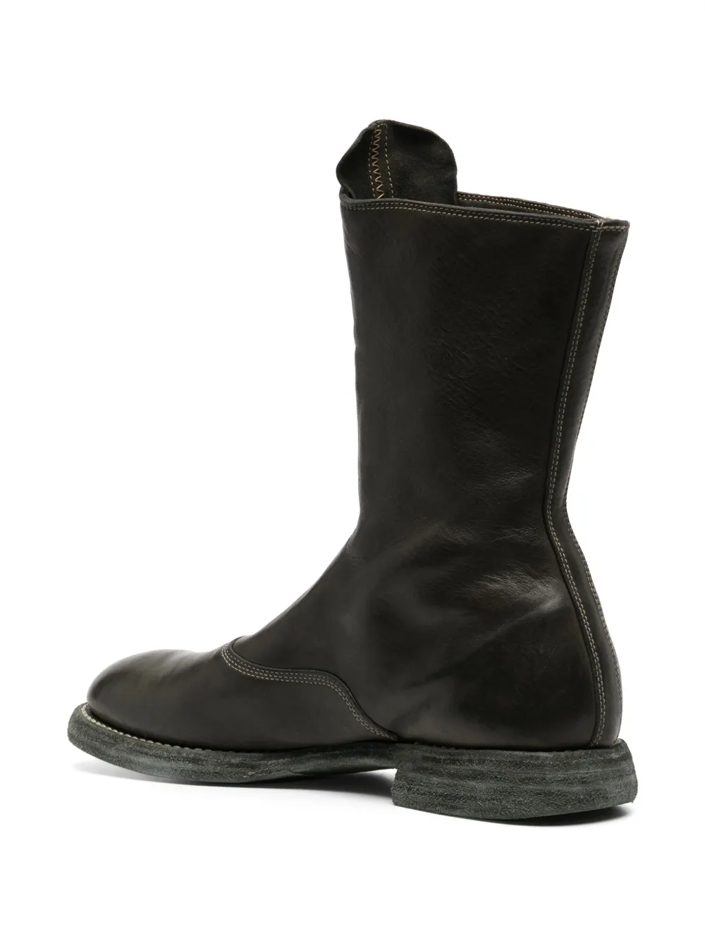 Темно-зеленый, телячья кожа, декоративная строчка, длина до середины икры, петля для подтягивания на язычке, застежка на молнии спереди, закругленный носок, низкий блочный каблук и кожаная подошва.