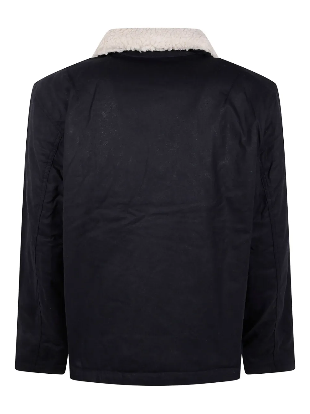 Черная куртка с застежкой на пуговицы, кулиской по подолу, воротником из овчины и нашивкой с логотипом