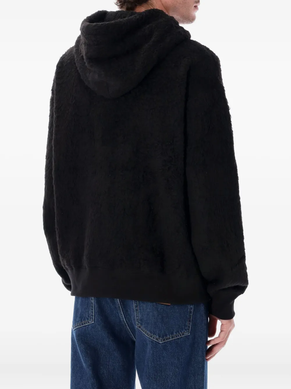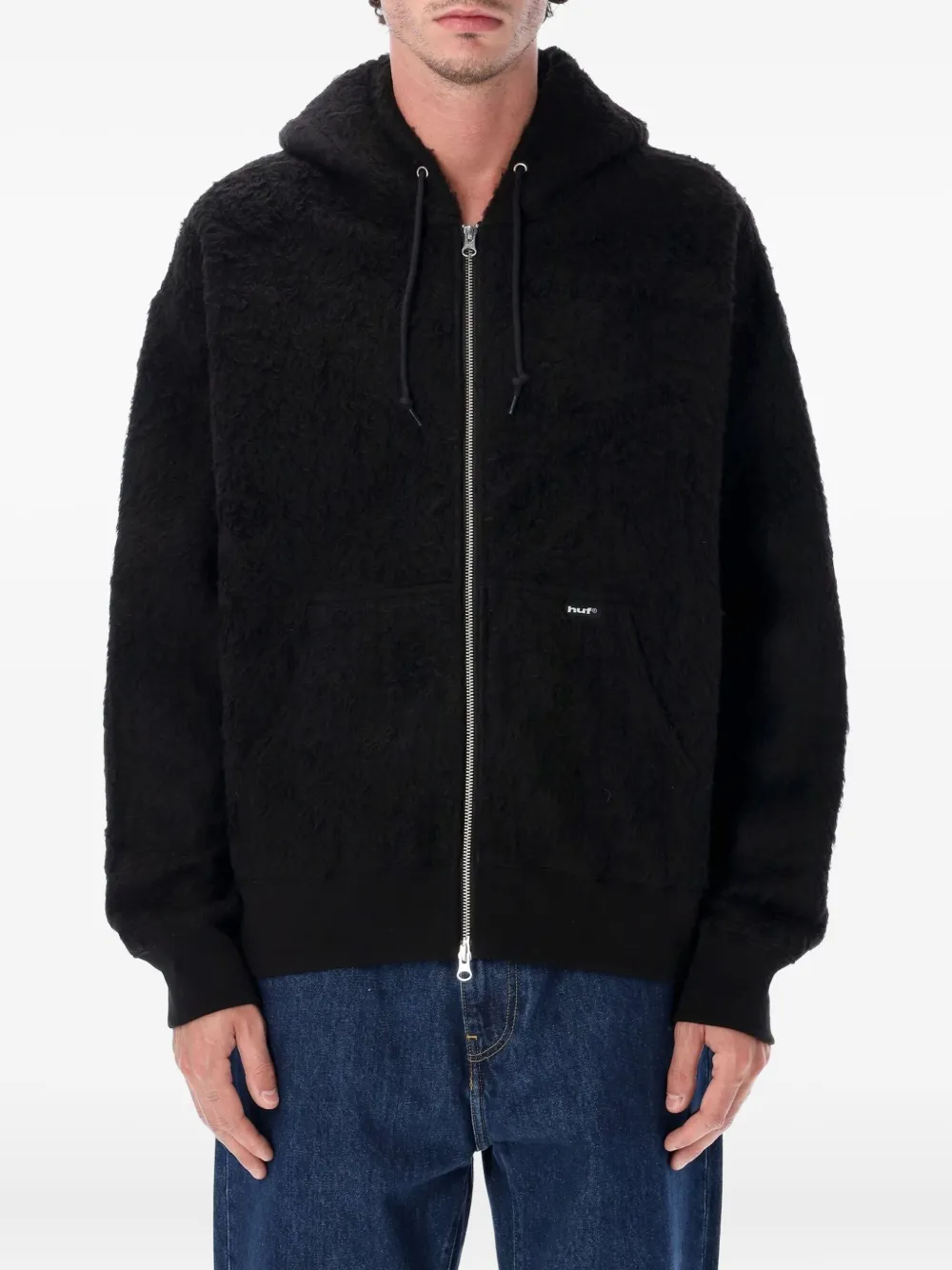 Черная худи на молнии с капюшоном, карманом-кенгуру, длинными рукавами и ребристым подолом