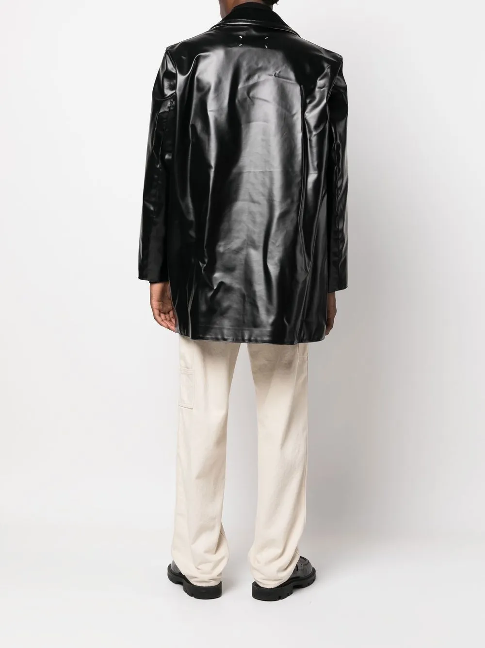 Черный, хлопок, глянцевая фактура, отложный воротник, длинные рукава, двубортная застежка на кнопки и два кармана с клапанами по бокам.
