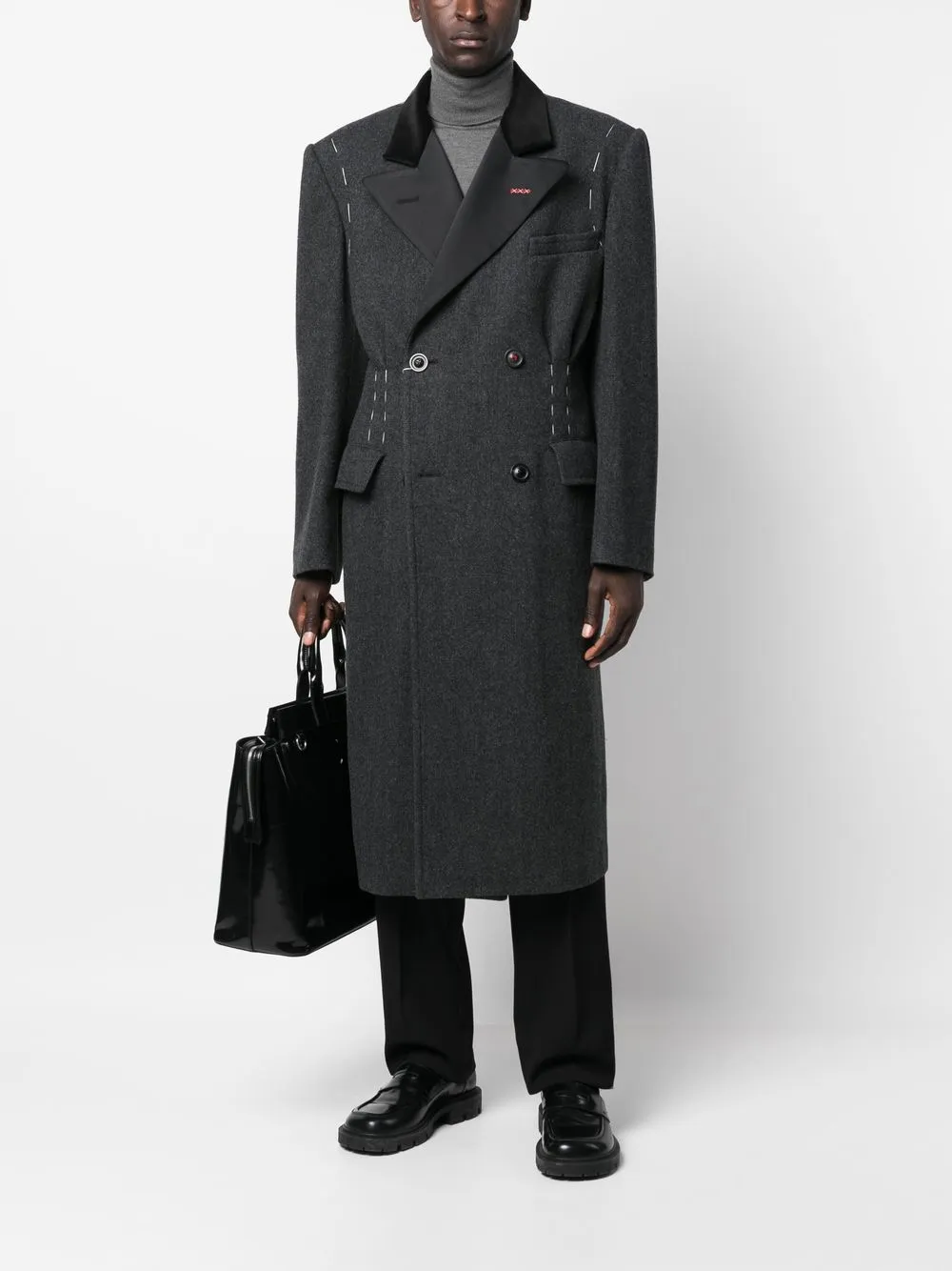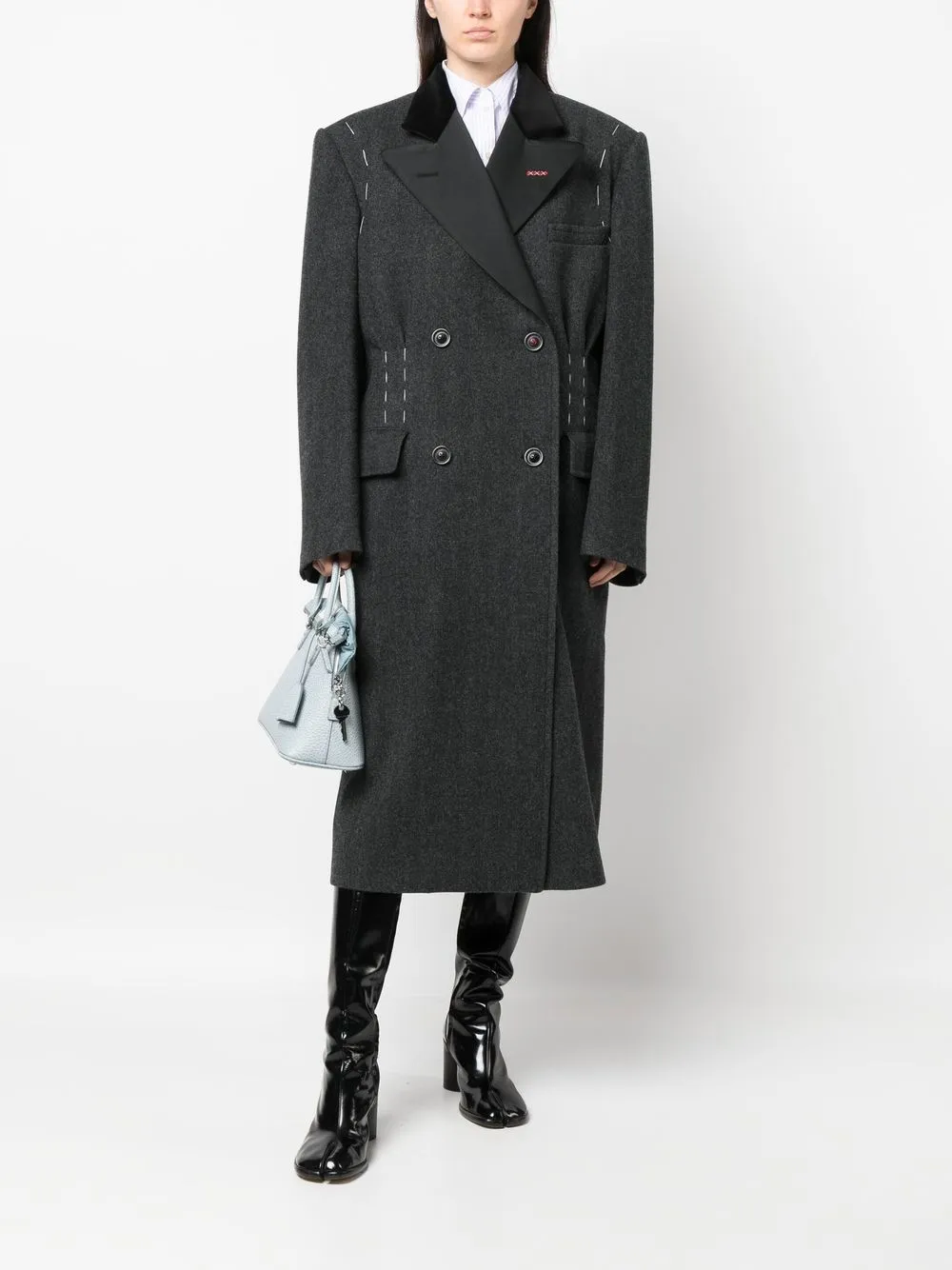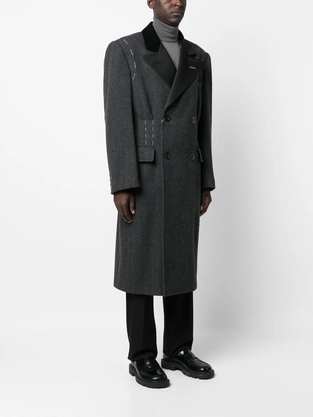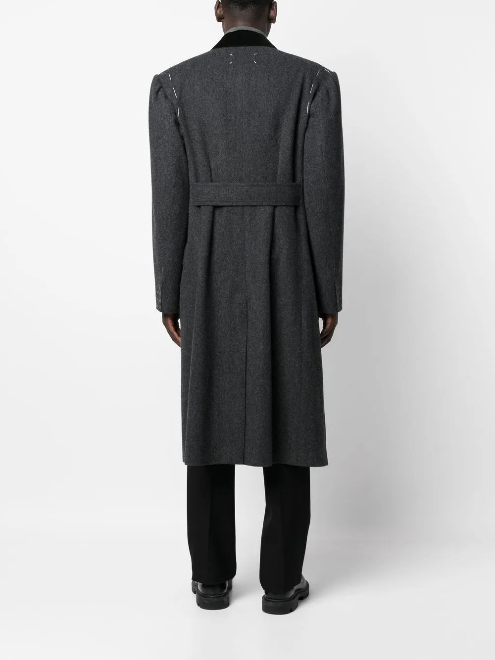 • Двубортное шерстяное пальто от Maison Margiela. Декоративная строчка, прорезной карман на груди, два кармана с клапанами по бокам, двубортная застежка на кнопки, зазубренные лацканы, длинные рукава, длина миди и прямой подол. Цвет: серый. Это унисекс-модель. Обратите внимание, что для нее используется мужская размерная сетка