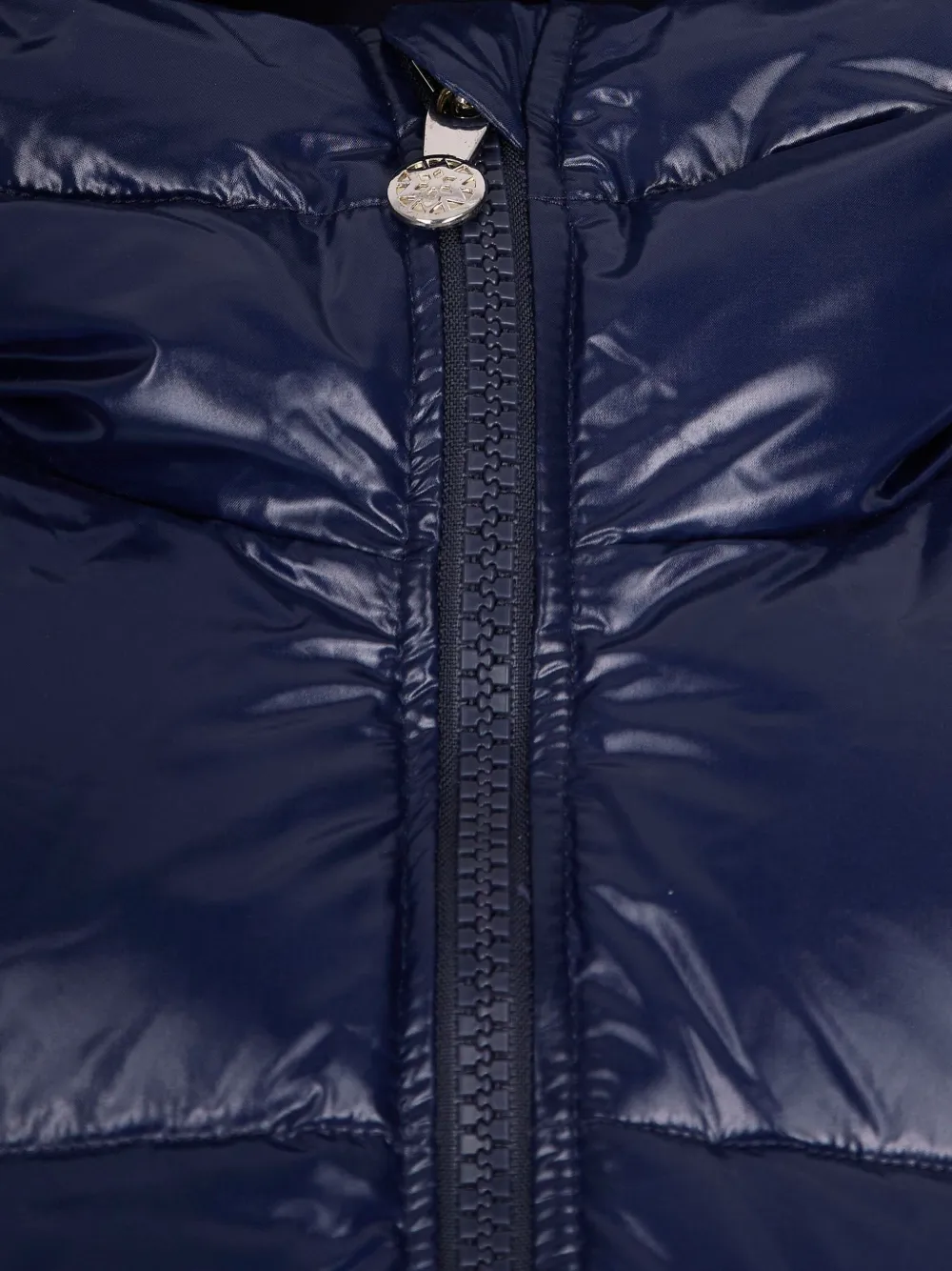 Темно-синий блестящая ткань застежка-молния спереди стеганый дизайн капюшон на кулиске