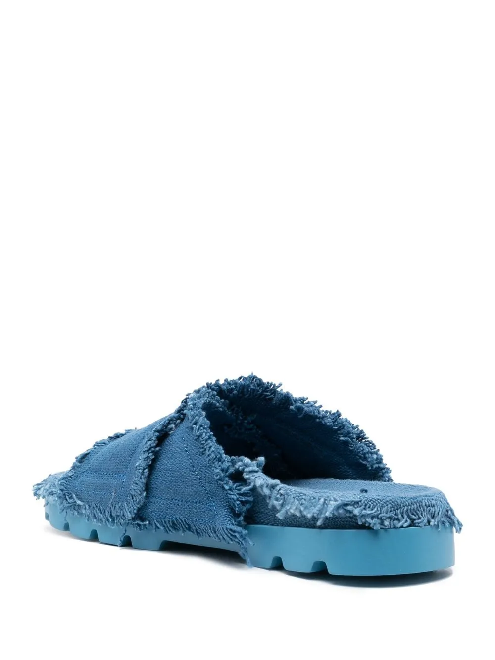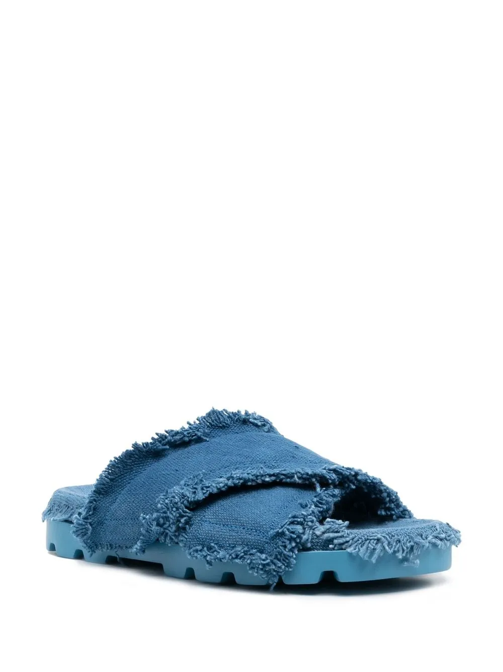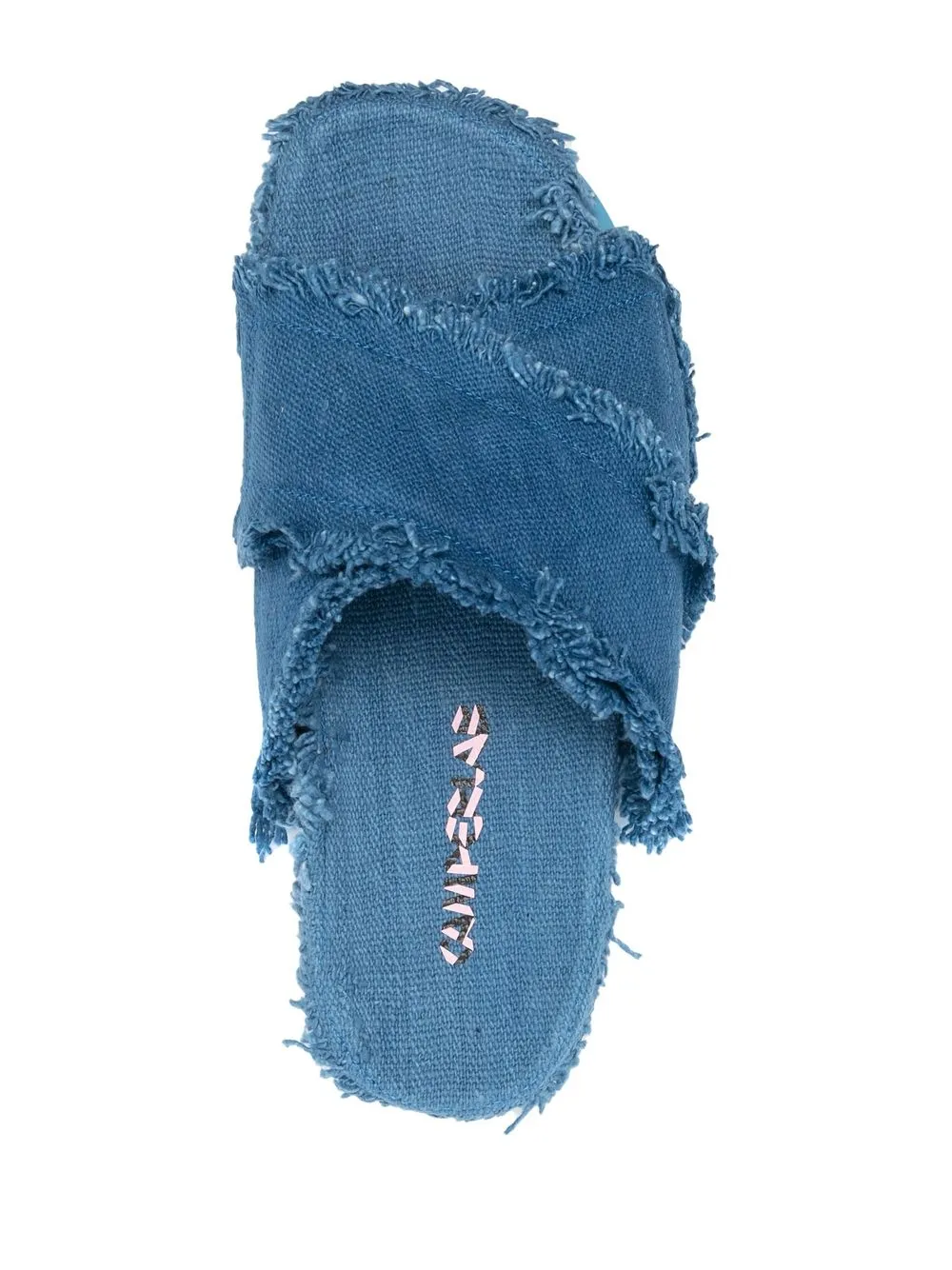 • Синий, хлопок, необработанные края, перекрестные ремешки, модель без застежки, без задника и рифленая резиновая подошва.