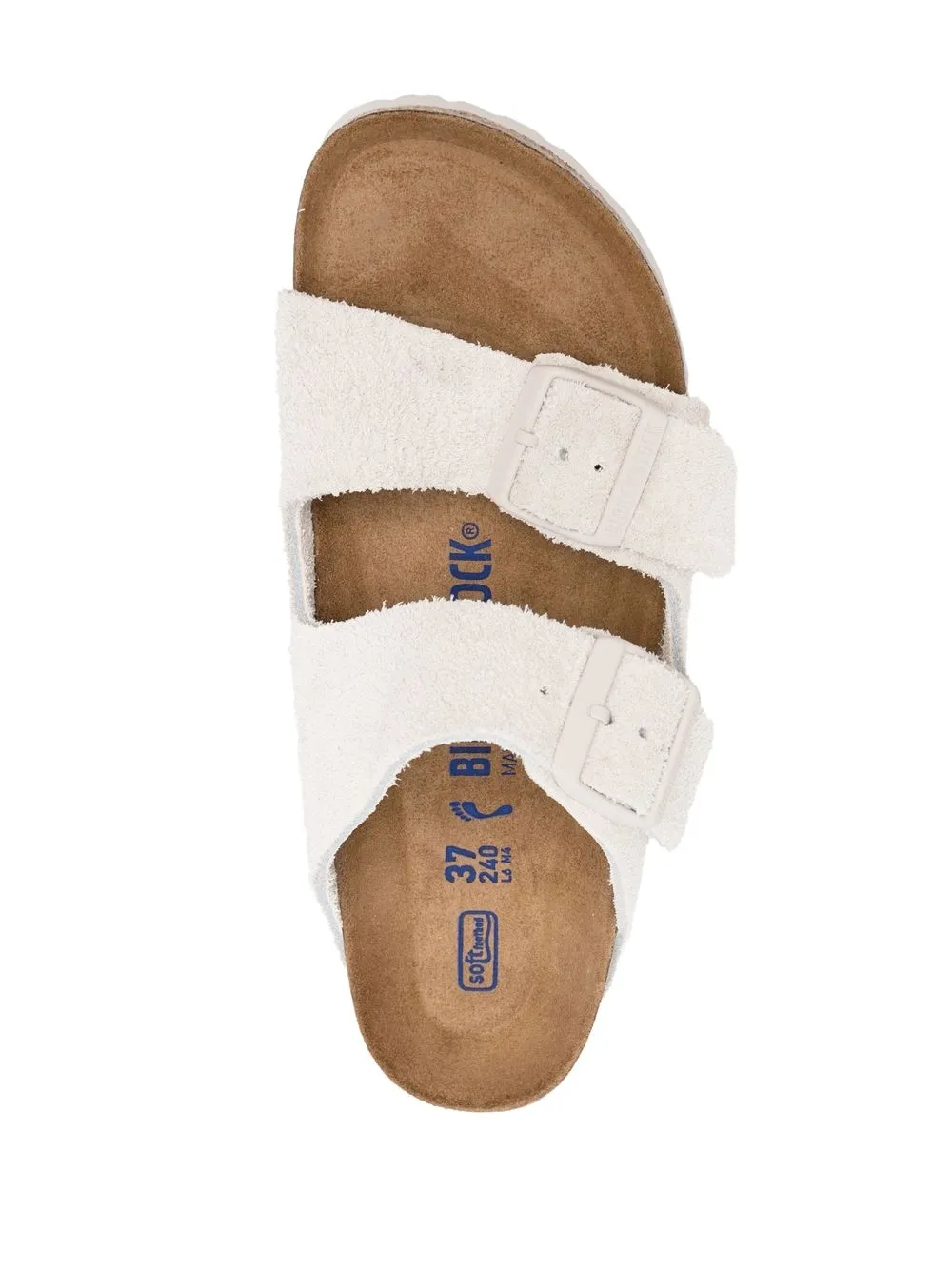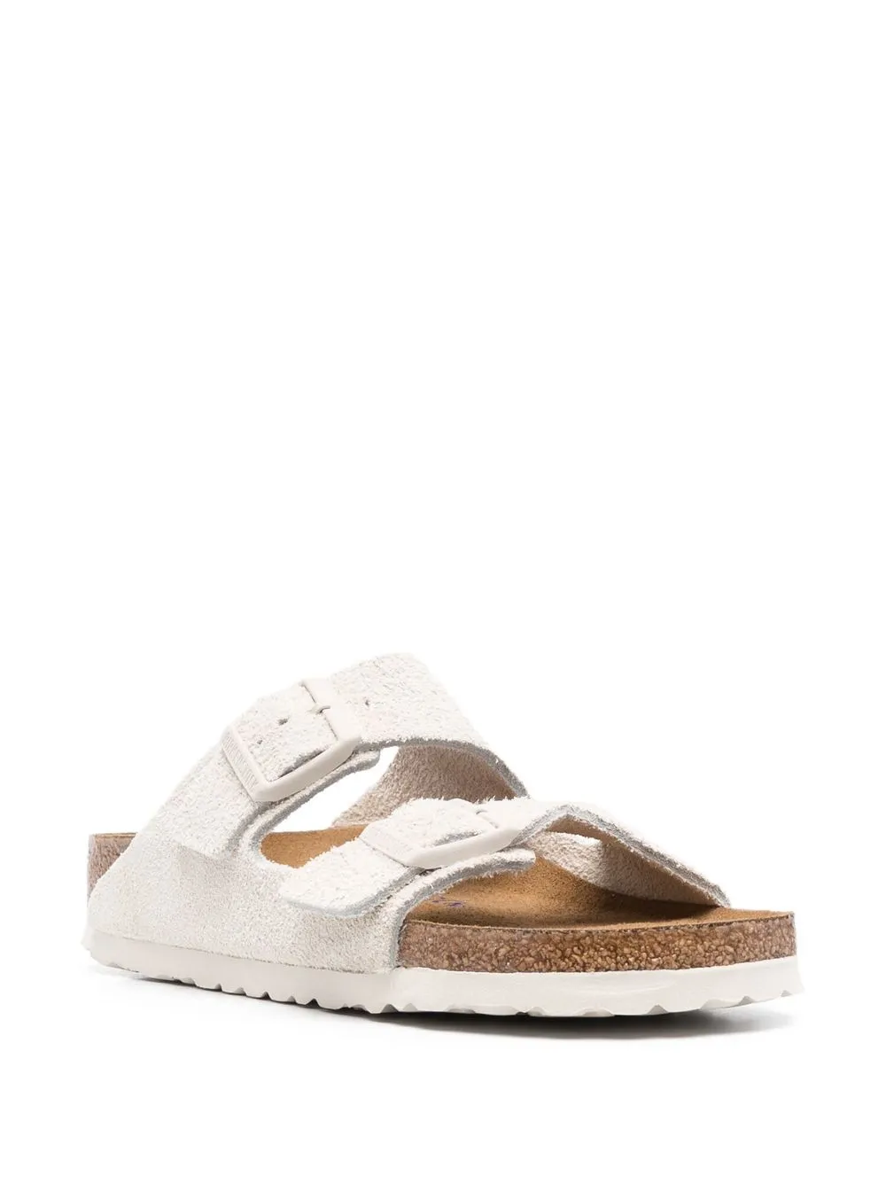 Кремовый, замша из телячьей кожи, фактурная отделка, застежка с двумя пряжками, открытый носок, формованная стелька, стелька с логотипом и плоская кожаная подошва.