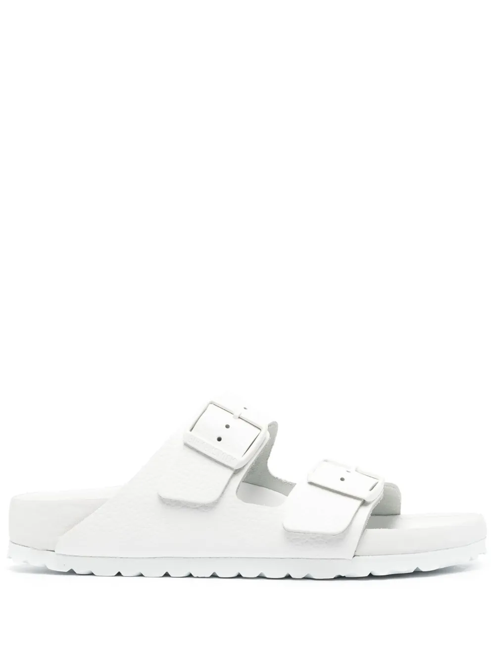 Белый, телячья кожа, кожаная стелька с логотипом, открытый носок, модель без застежки, боковые застежки с пряжками и плоская резиновая подошва.