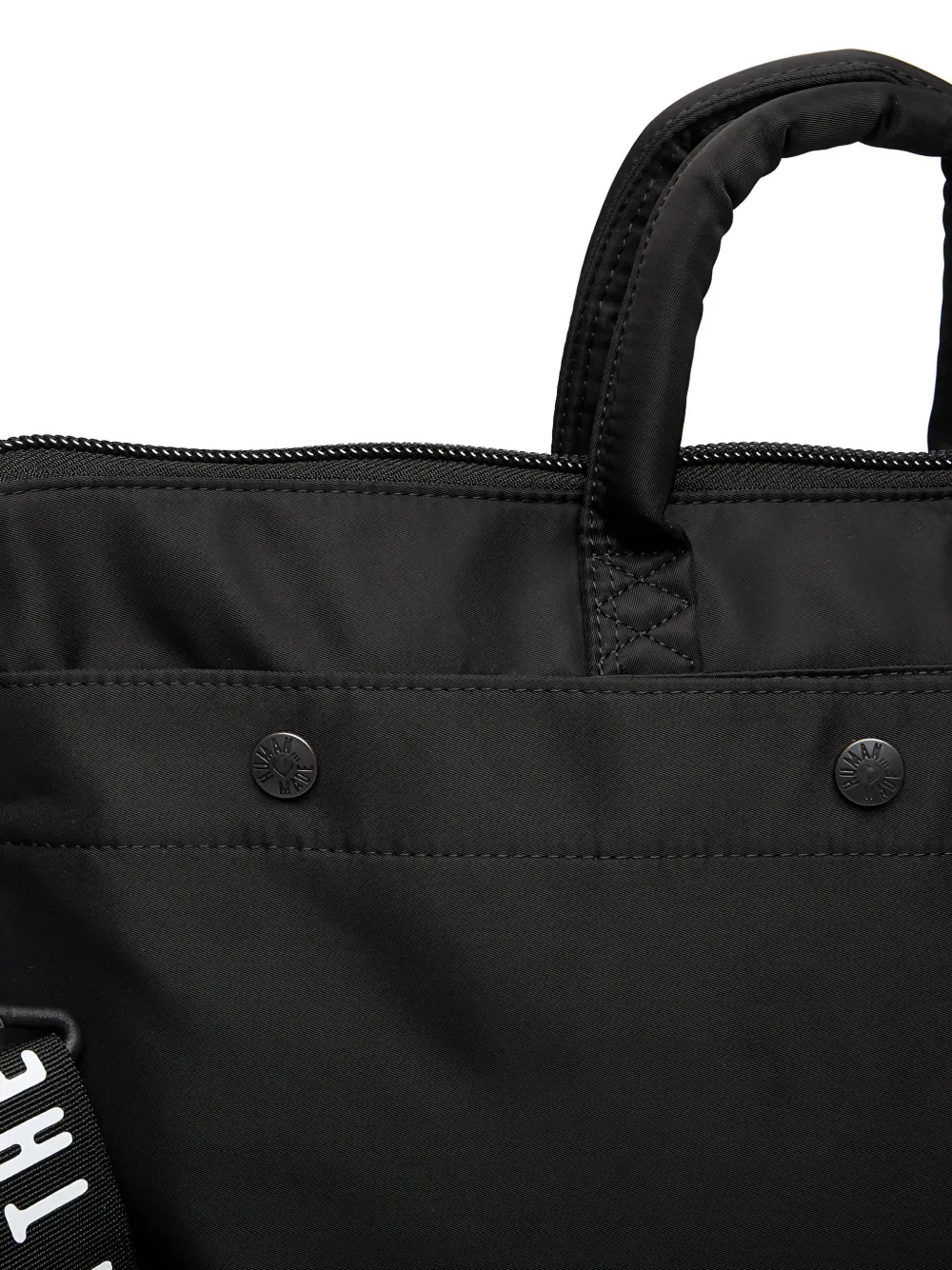 Черная сумка с текстильной ручкой, верхней ручкой, застежкой на молнии, кнопками и плечевым ремнем