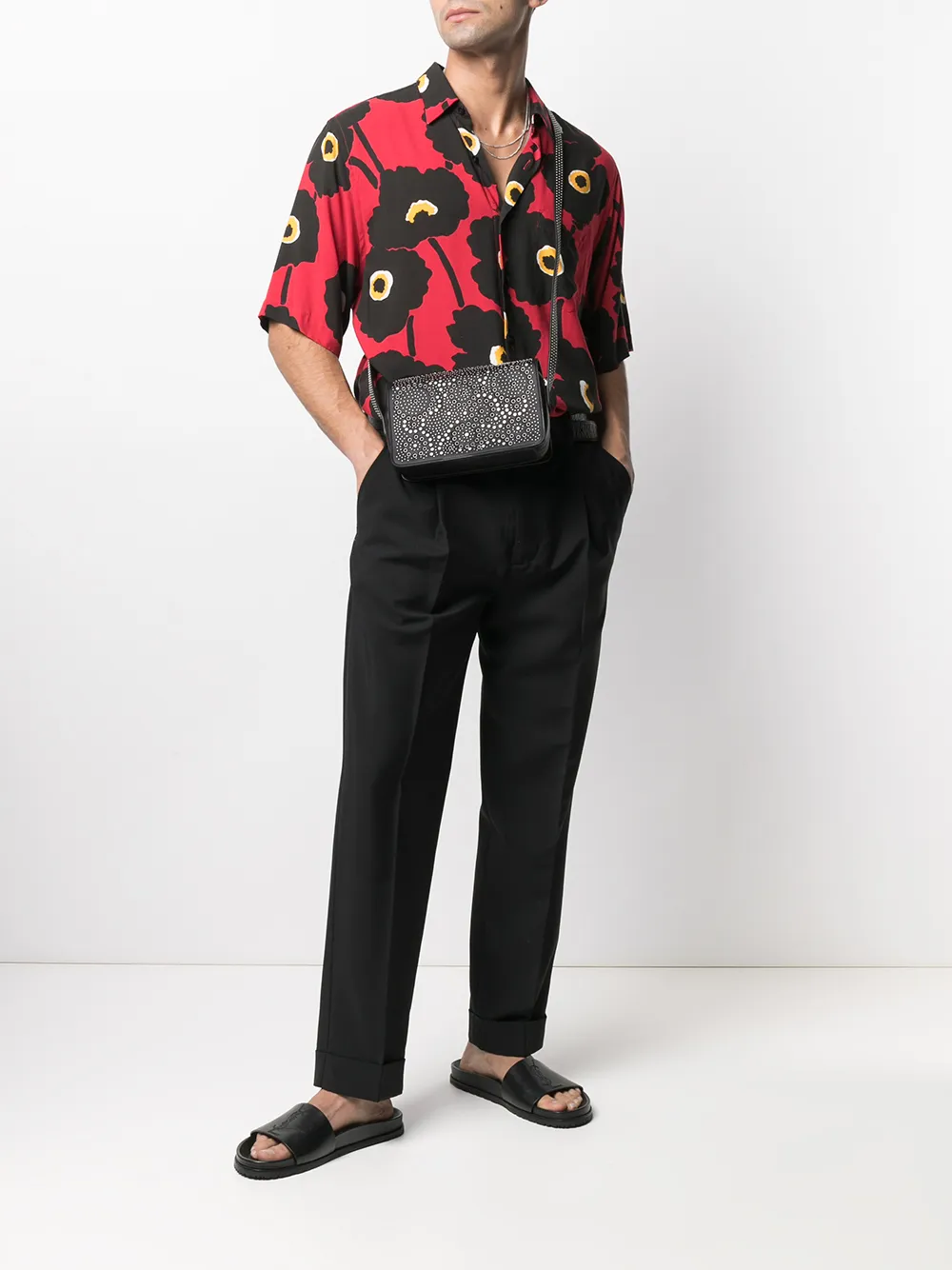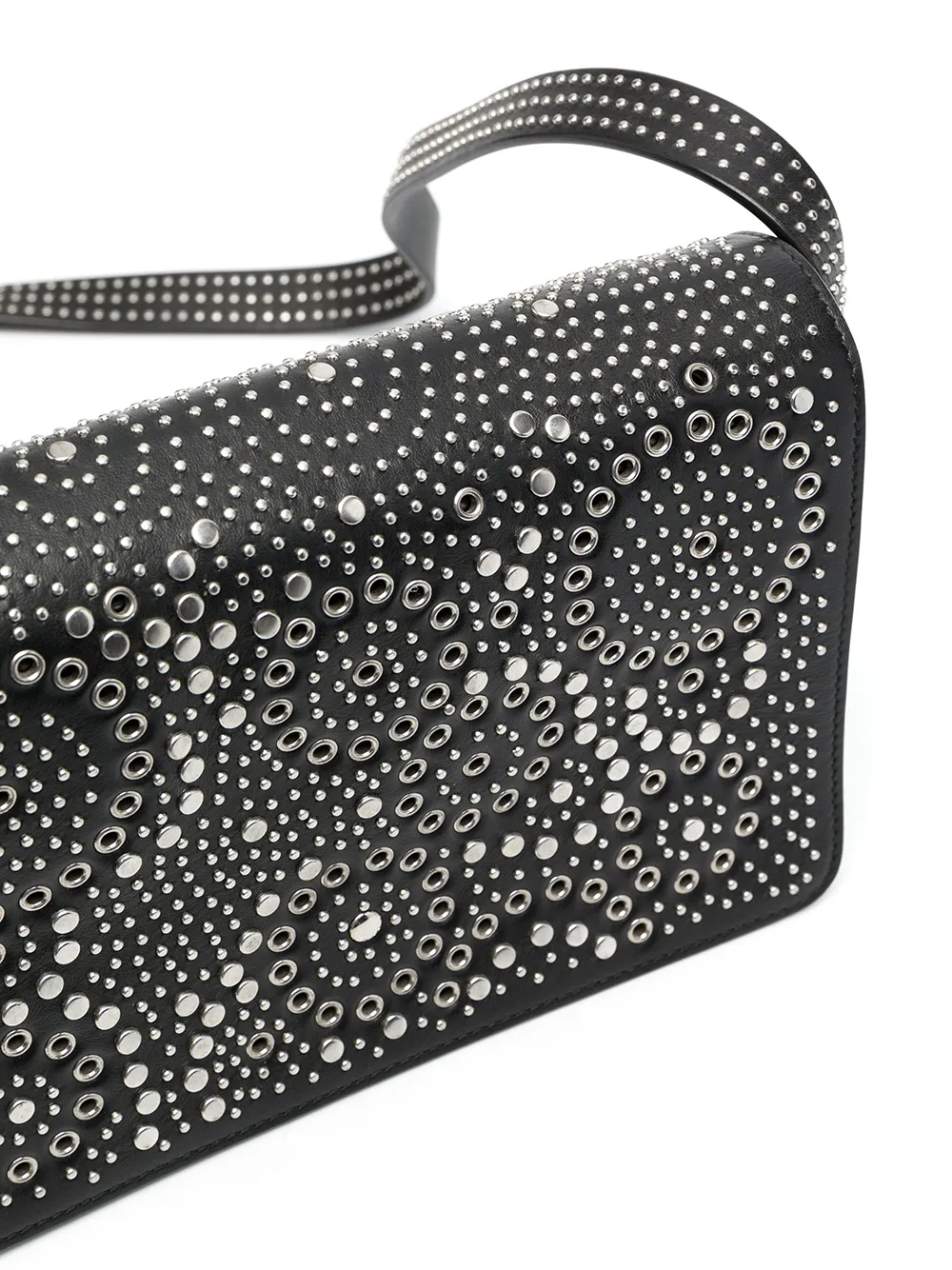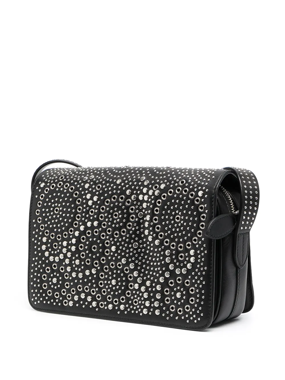 Серебристые заклепки, люверсы, прорезной карман спереди, застежка на молнии сверху, основное отделение, внутренний карман на молнии и ремень на плечо. Цвет: черный.