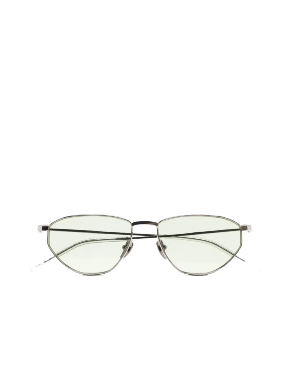 Серебристая оправа геометрической формы, носоупоры, тонированные линзы. В комплекте футляр.