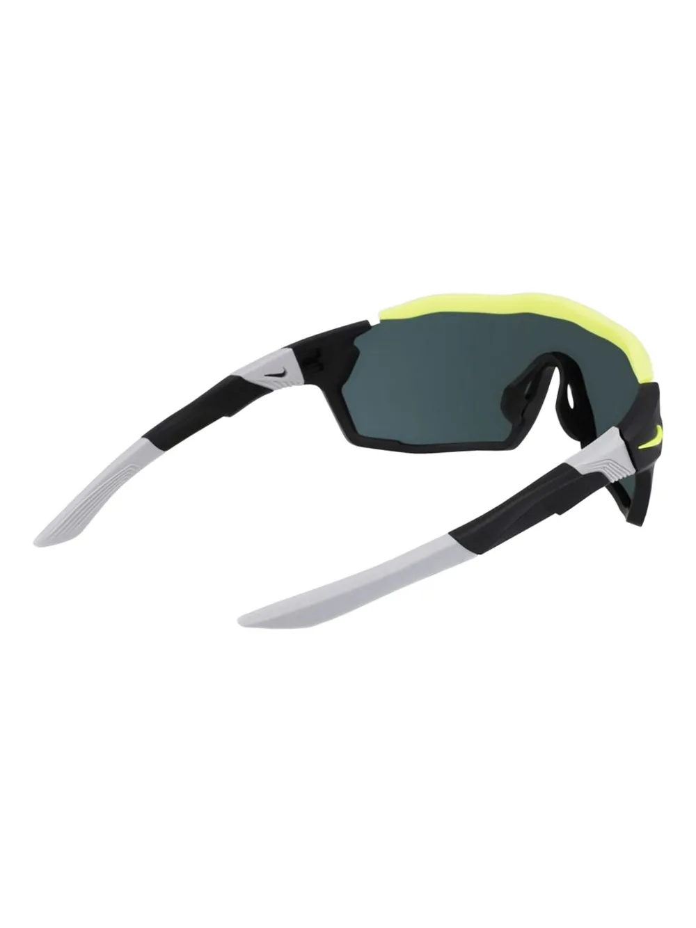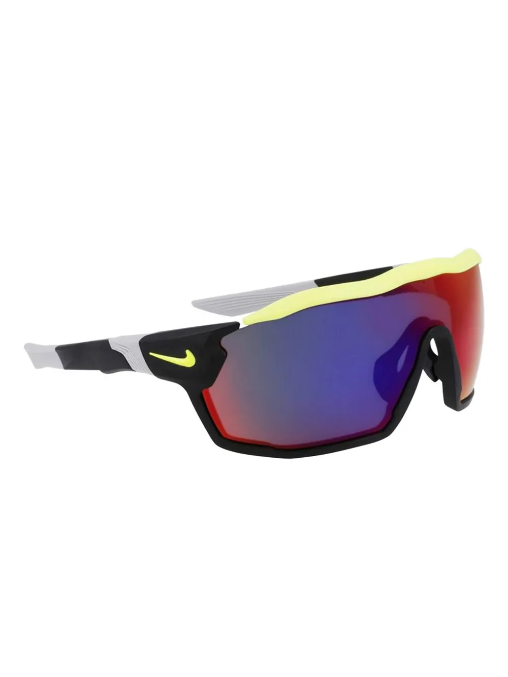 Черная/разноцветная оправа-щит, зеркальные линзы, фирменный логотип Swoosh, прямые дужки, прямые наконечники. В комплекте защитный чехол.