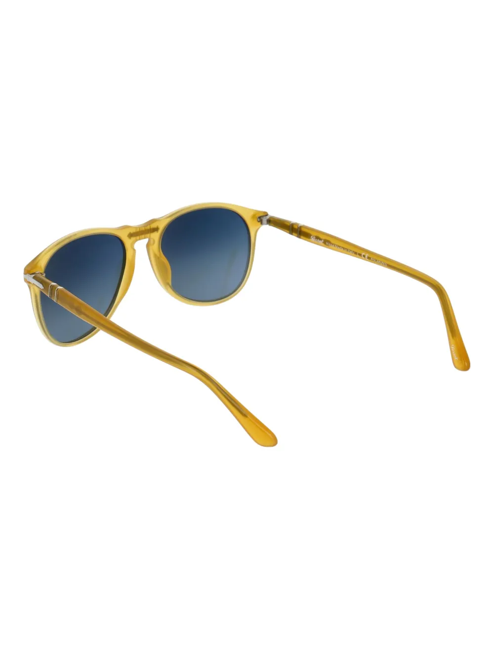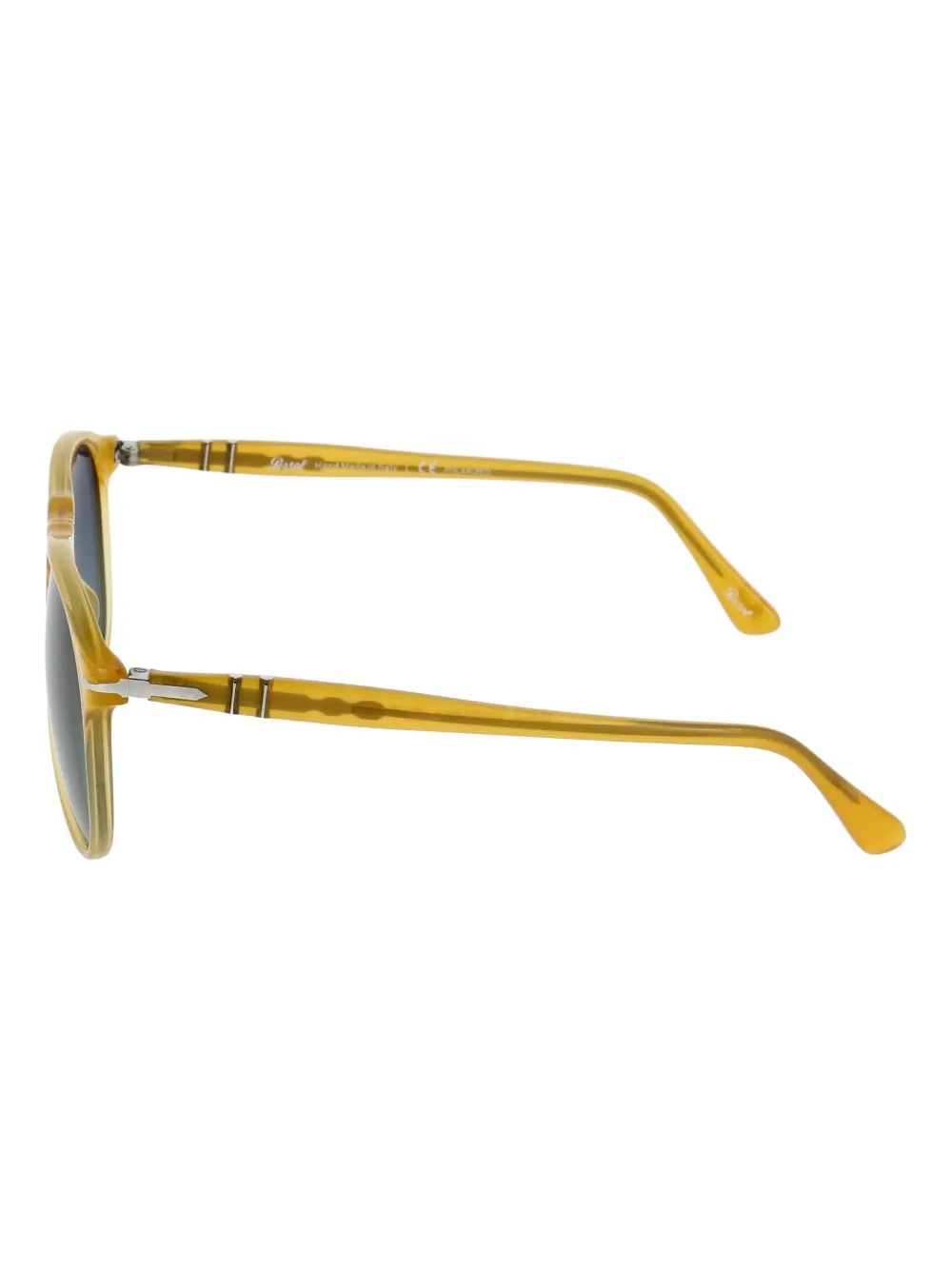Солнцезащитные очки PO0649 от Persol. Затемненные линзы, круглые оправы, металл цвета серебра, логотип на рукаве и прямые дужки с остро изогнутыми концами. Цвет: желтый.