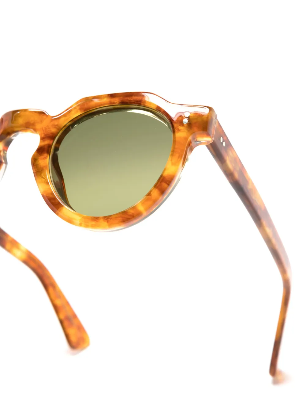 Темно-коричневый, ацетат, черепаховая расцветка, круглая оправа, затемненные линзы зеленого цвета, линзы с защитой от ультрафиолета, завышенный мост, носоупоры, прямые дужки и дужки с закругленными концами. В комплект входит защитный чехол для очков.