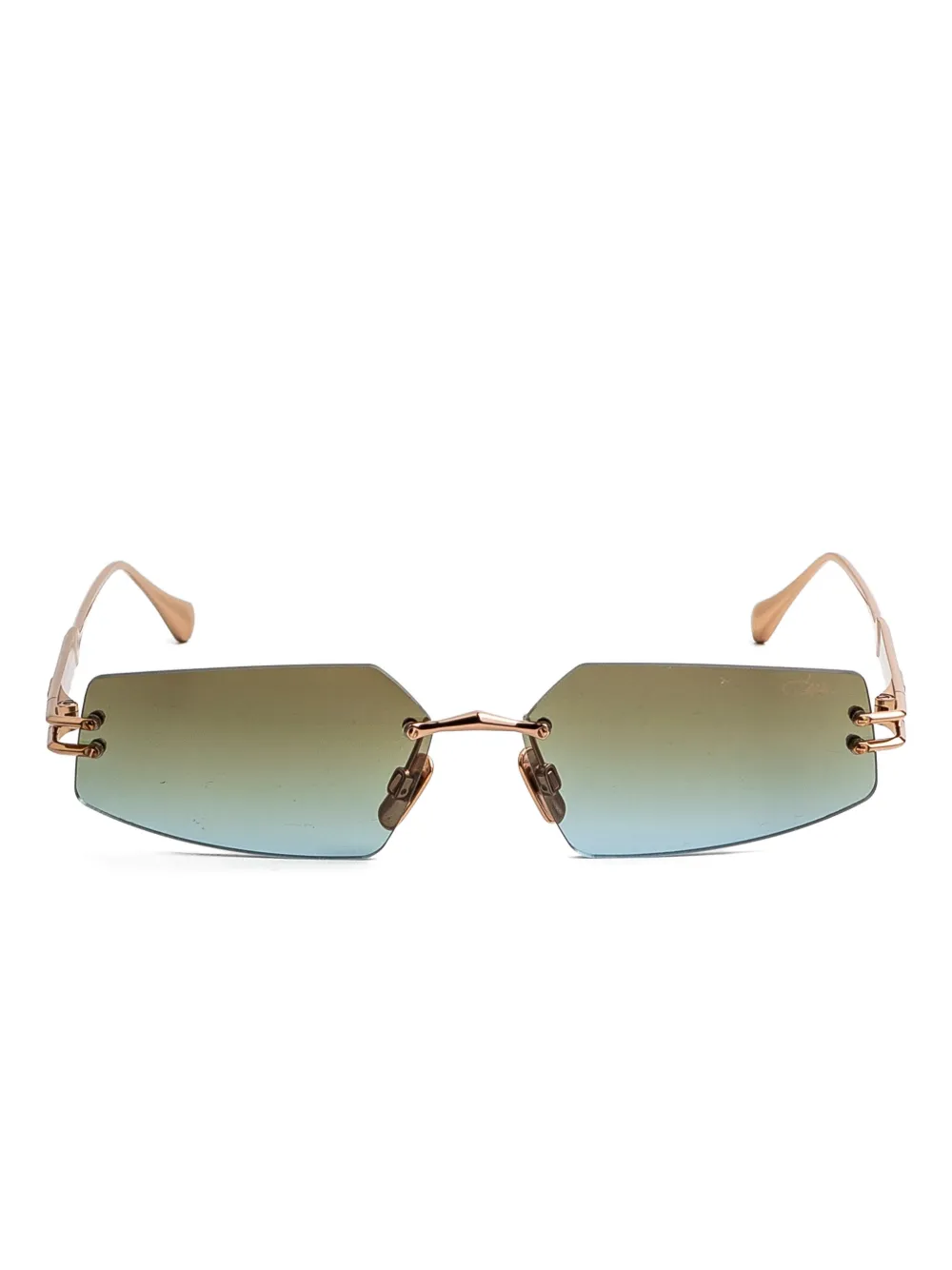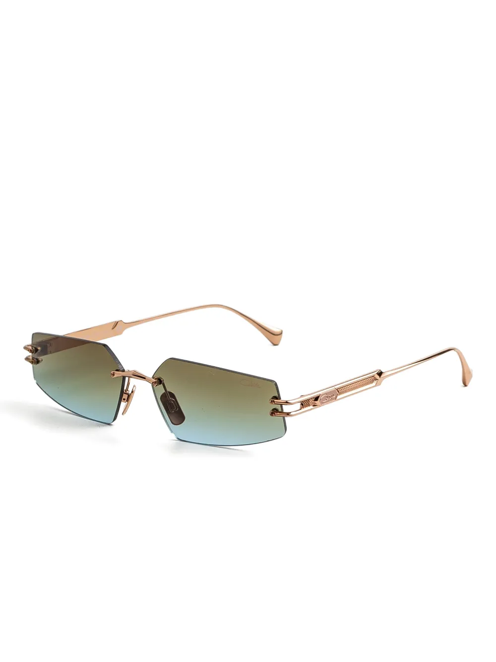 Оправа золотистого цвета безободковая, с гравировкой на дужках, носоупоры, геометрическая форма. Очки поставляются с защитным футляром.