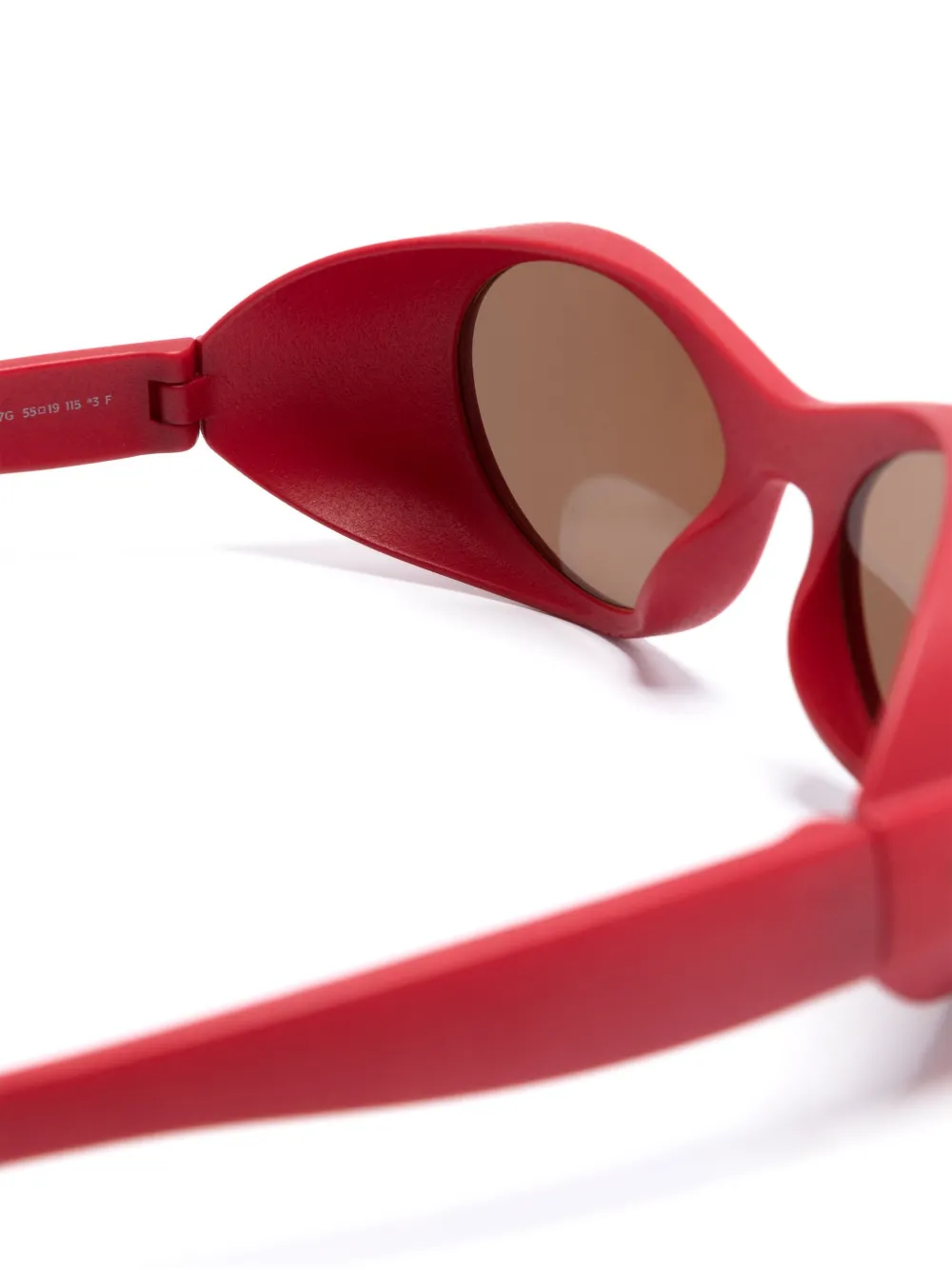 Ярко-красный, ацетат, зернистая текстура, овальная оправа, зеркальные линзы, линзы с защитой от ультрафиолета, логотип на дужке, скульптурные дужки и прямые наконечники дужек. В комплект входит защитный чехол для очков.