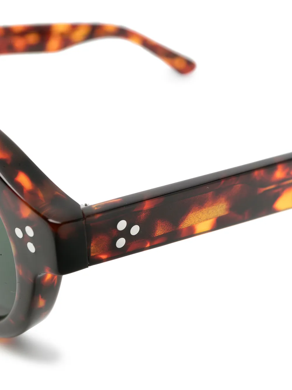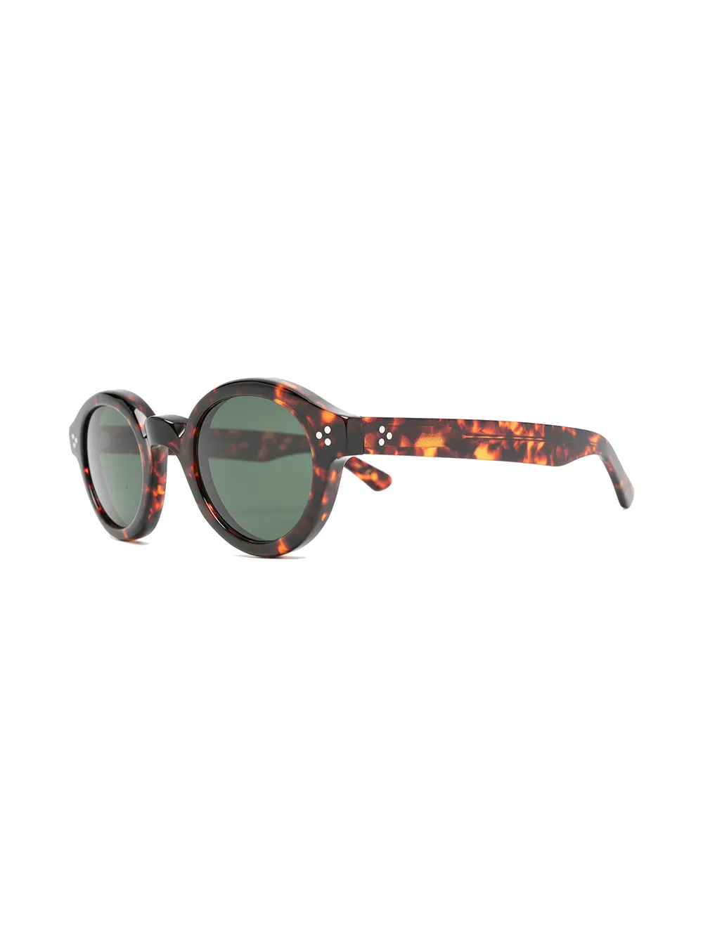 Затемненные линзы зеленого цвета, круглая оправа, широкие дужки и прямые наконечники дужек. Обратите внимание, что все очки, представленные на FARFETCH, продаются без диоптрий.