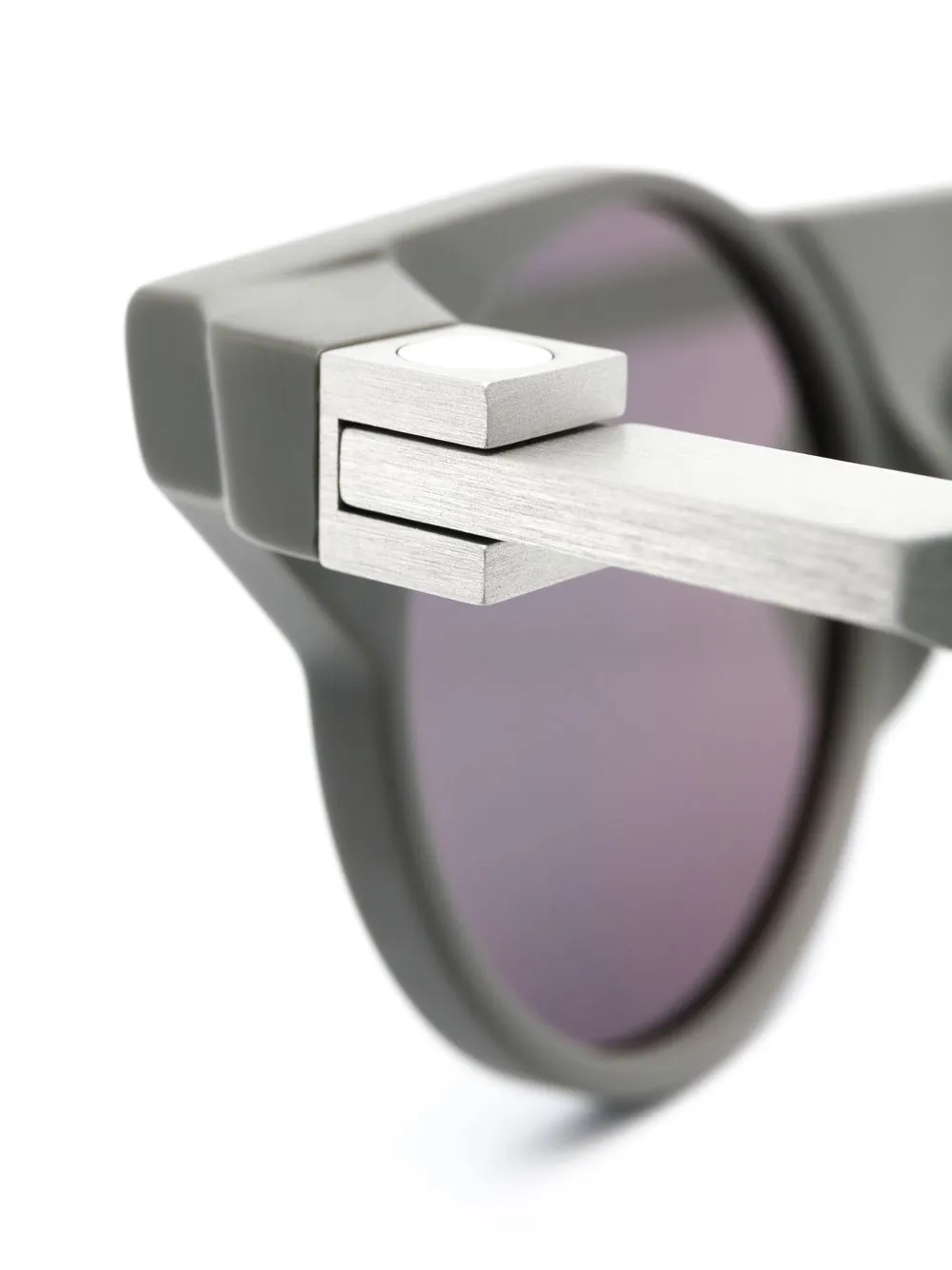 Темно-серый, ацетат, алюминий, оправа «кошачий глаз», затемненные линзы, линзы с защитой от ультрафиолета, защитная пленка, серебристая фурнитура, прямые дужки, дужки с закругленными концами и легкий материал. В комплект входит защитный чехол для очков.