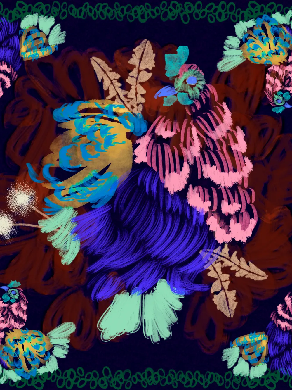 Голубой, зеленый и разноцветный принт с курицами, квадратной формы, с цветочной каймой