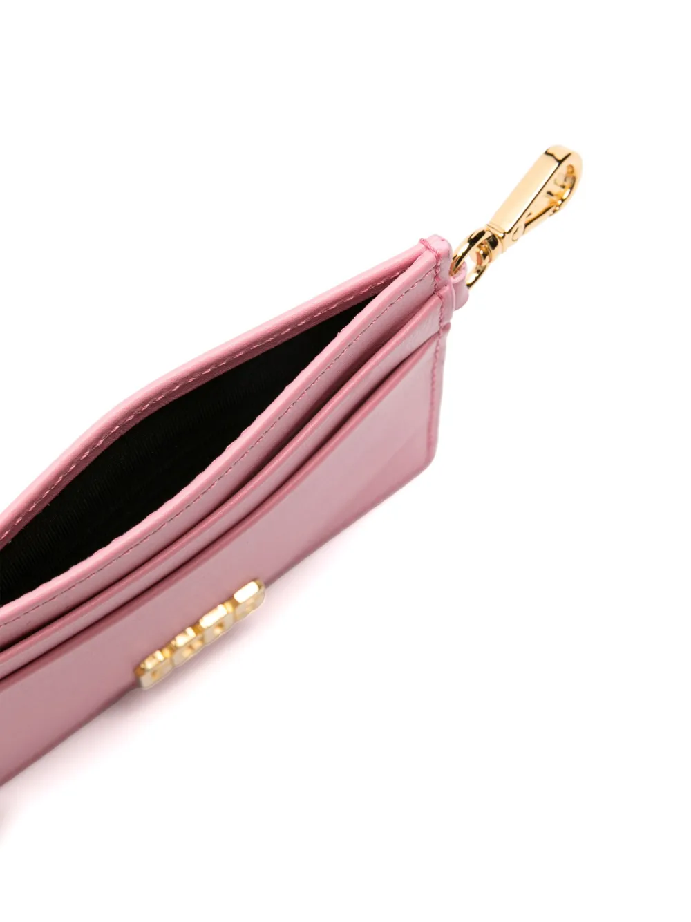 Металлический логотип, отделения для карт и золотистая фурнитура.