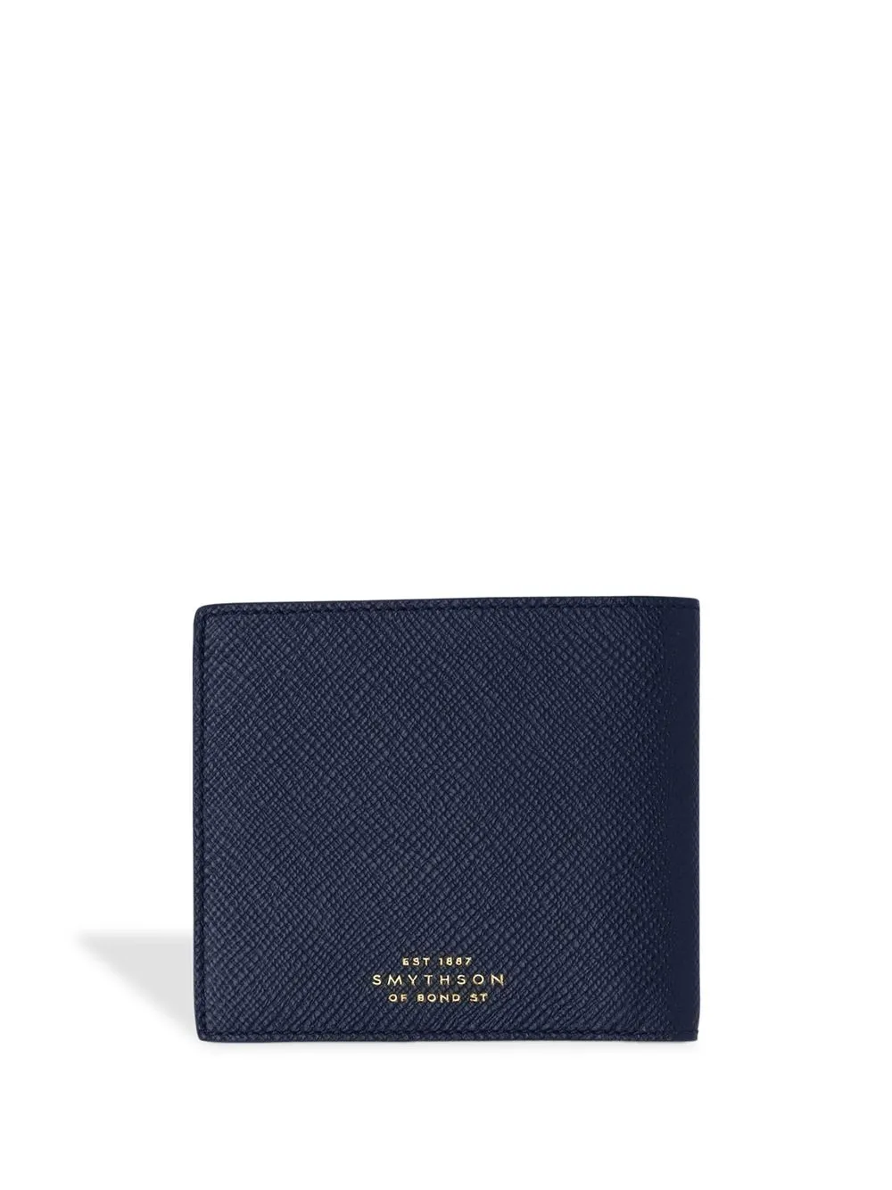 Темно-синий, телячья кожа, зернистая текстура, принт с логотипом сзади, внутренние отделения для карт, отделение для купюр и два сложения.