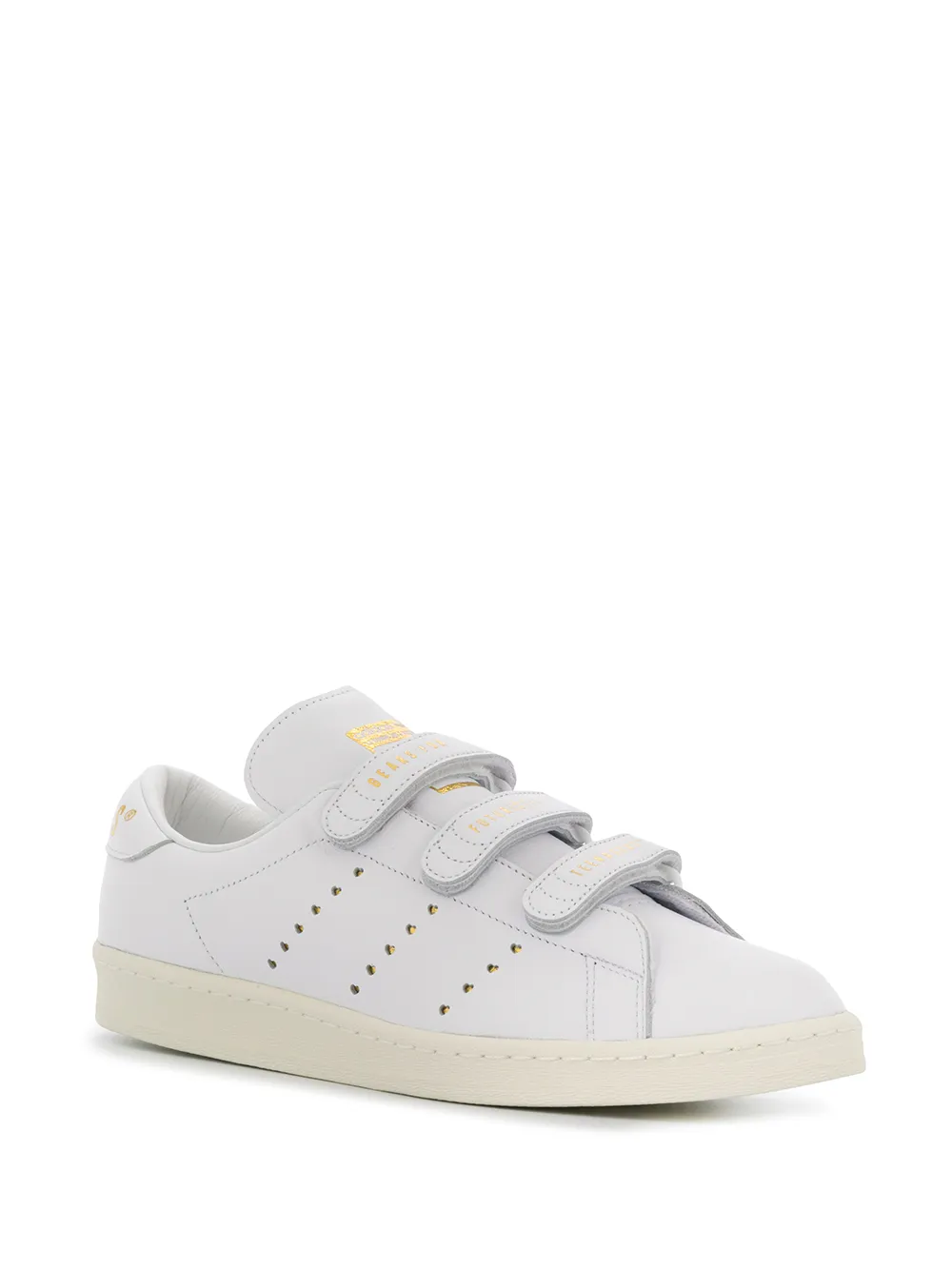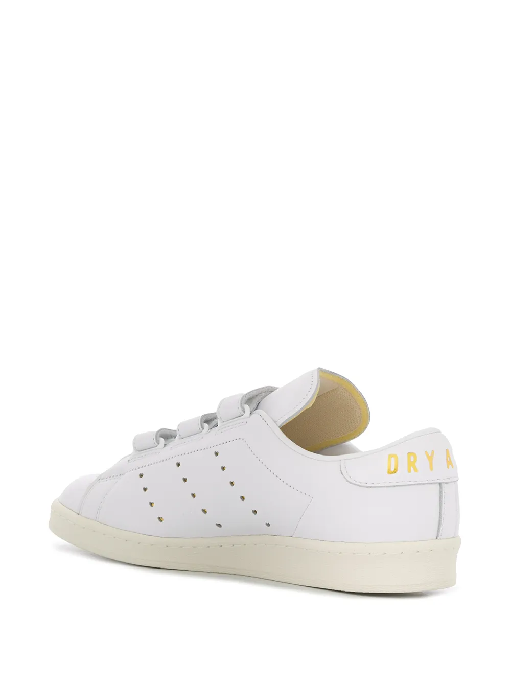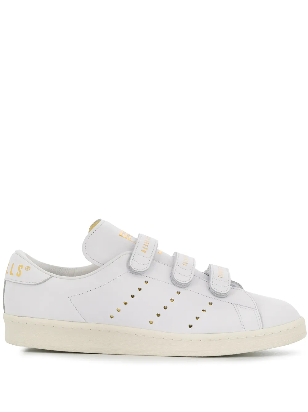 • Закругленный носок, перфорация, застежка на липучке сбоку и резиновая подошва. Цвет: белый.