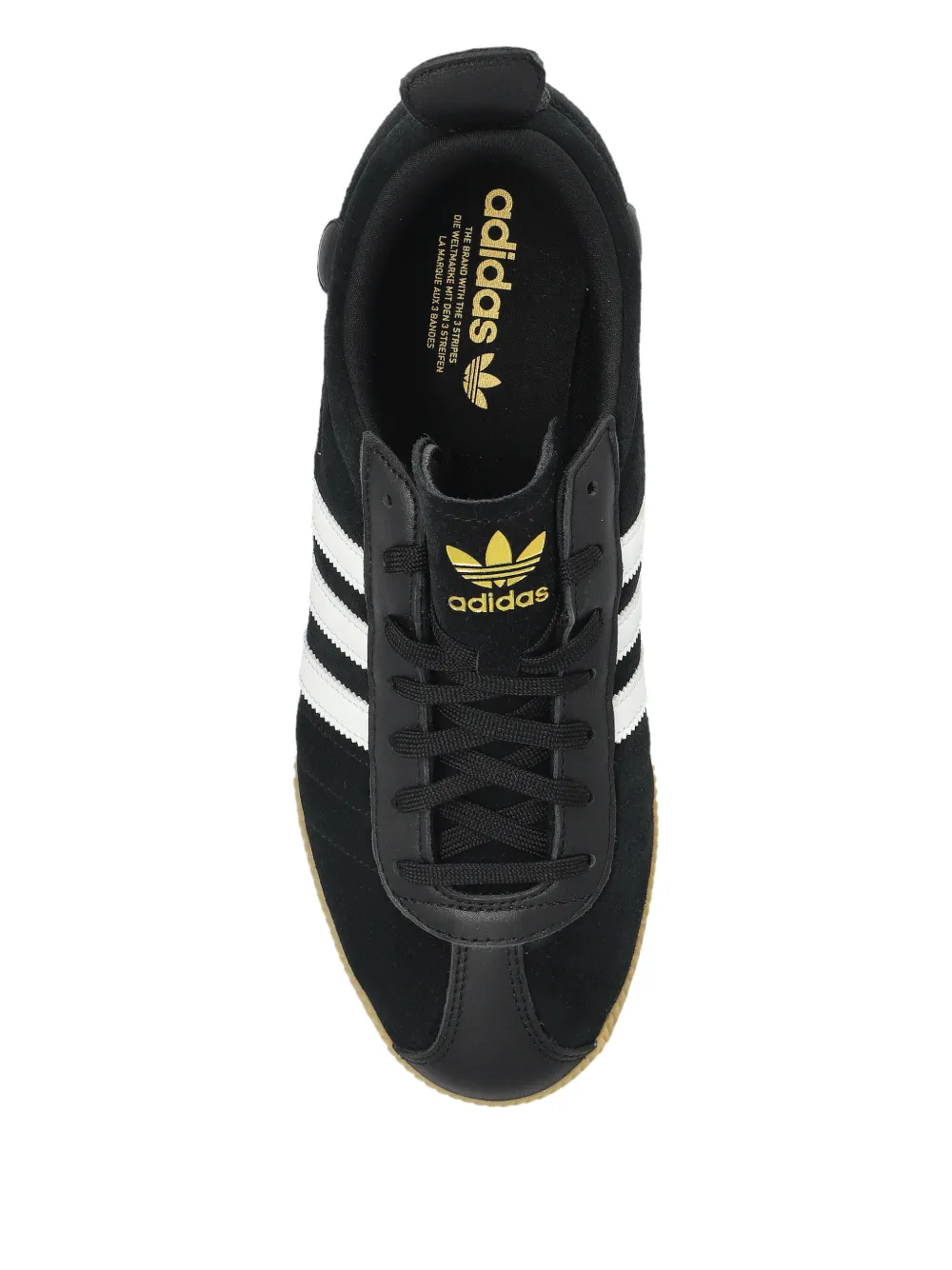 Черный цвет, фирменные 3 полоски, логотип, шнуровка, оформление с логотипом, круглый нос, петля на заднике, подошва из резины цвета жвачки